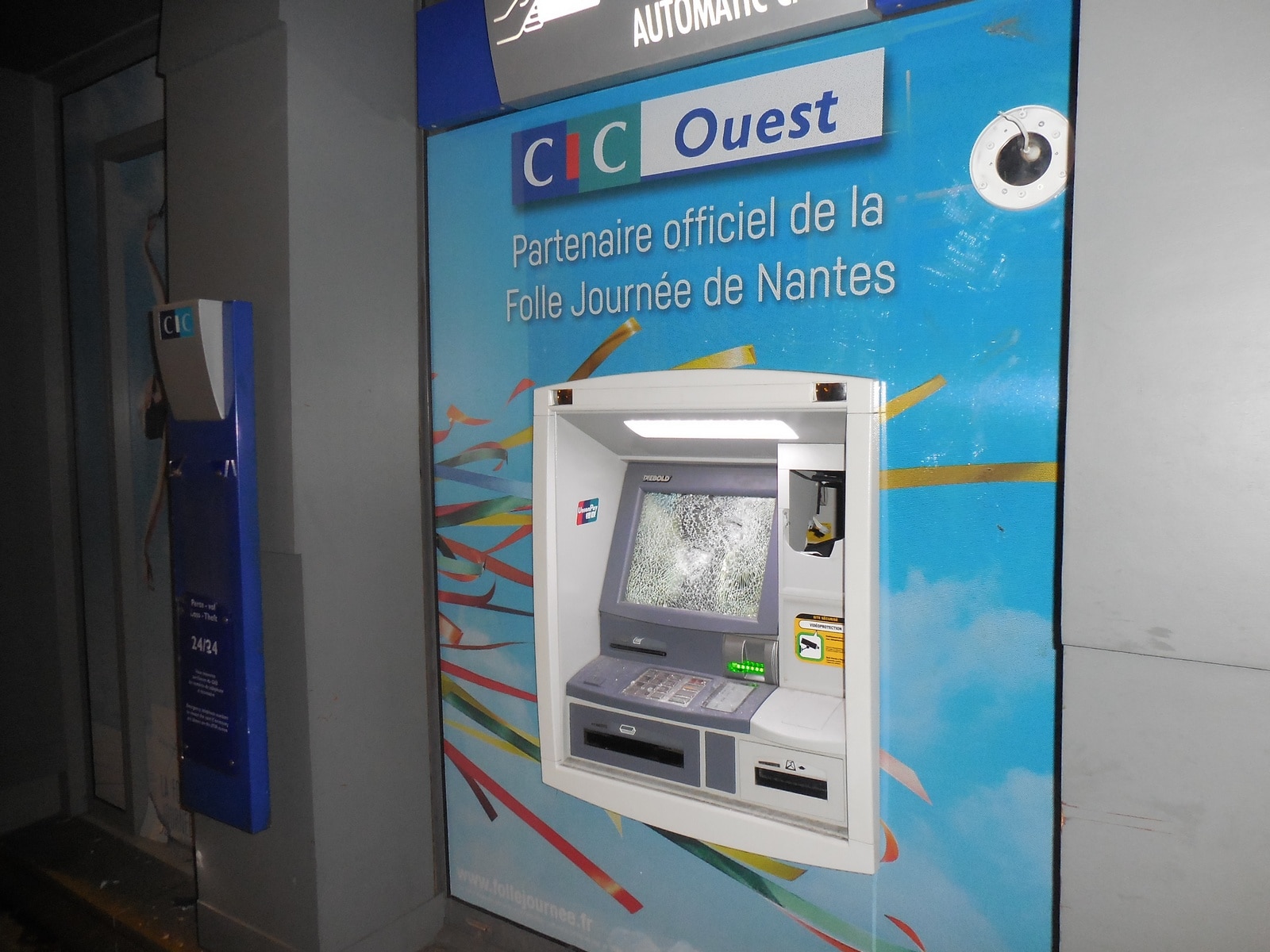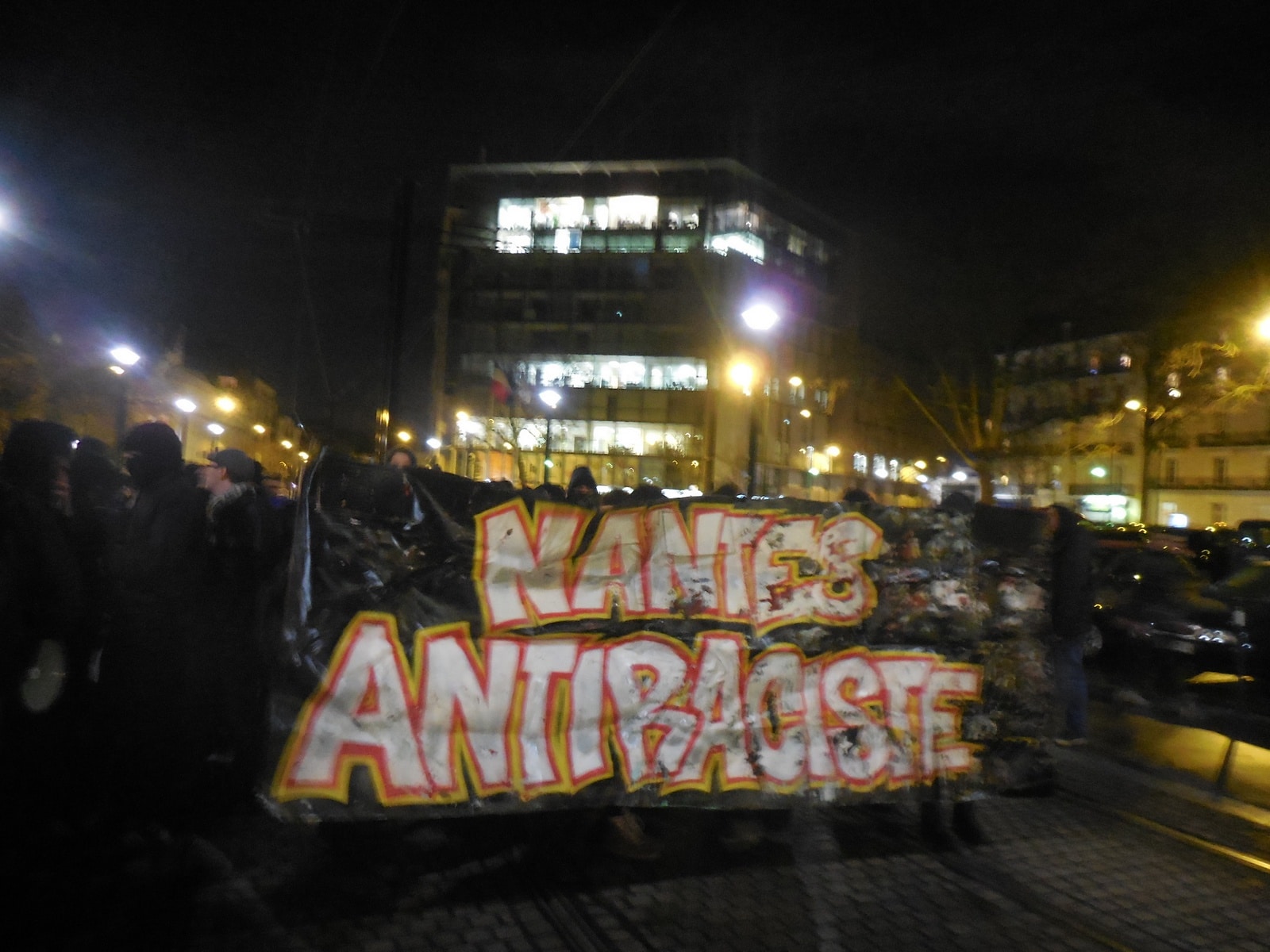 19h30. Derrière une banderole proclamant « Nantes Antiraciste », la manifestation s’ébranle, avec en queue de peloton quelques militants UDB – il y en a encore ! – derrière un drapeau breton. A l’avant du cortège, une centaine de personnes en vêtements sombres, têtes cagoulées, bâtons ou barres de fer en main. Certains, peu reconnaissants envers leurs sponsors, se sont déjà entraînés en détruisant un distributeur de billets en bas de la place Viarme et un panneau publicitaire place Bretagne dans l’après-midi.