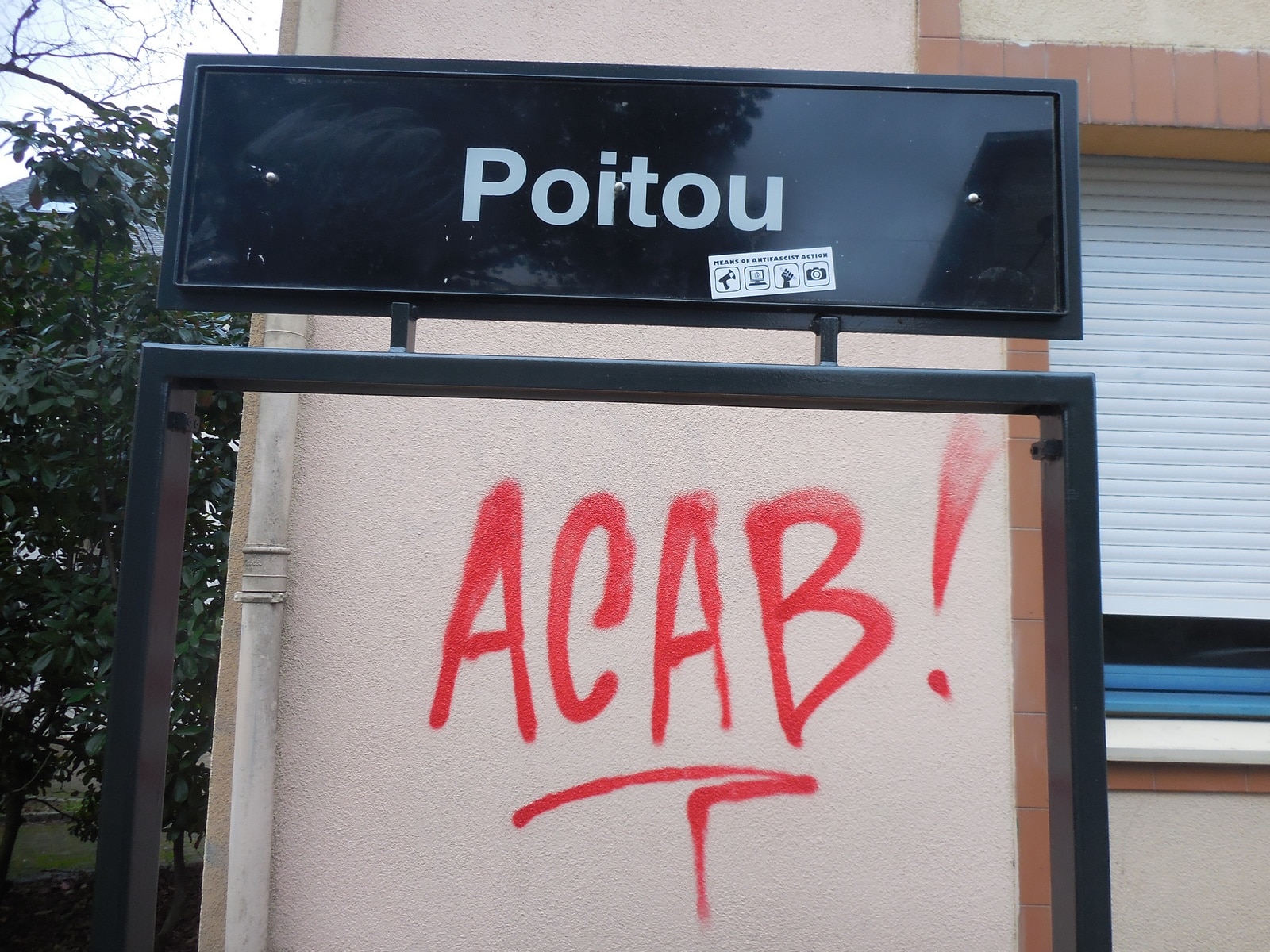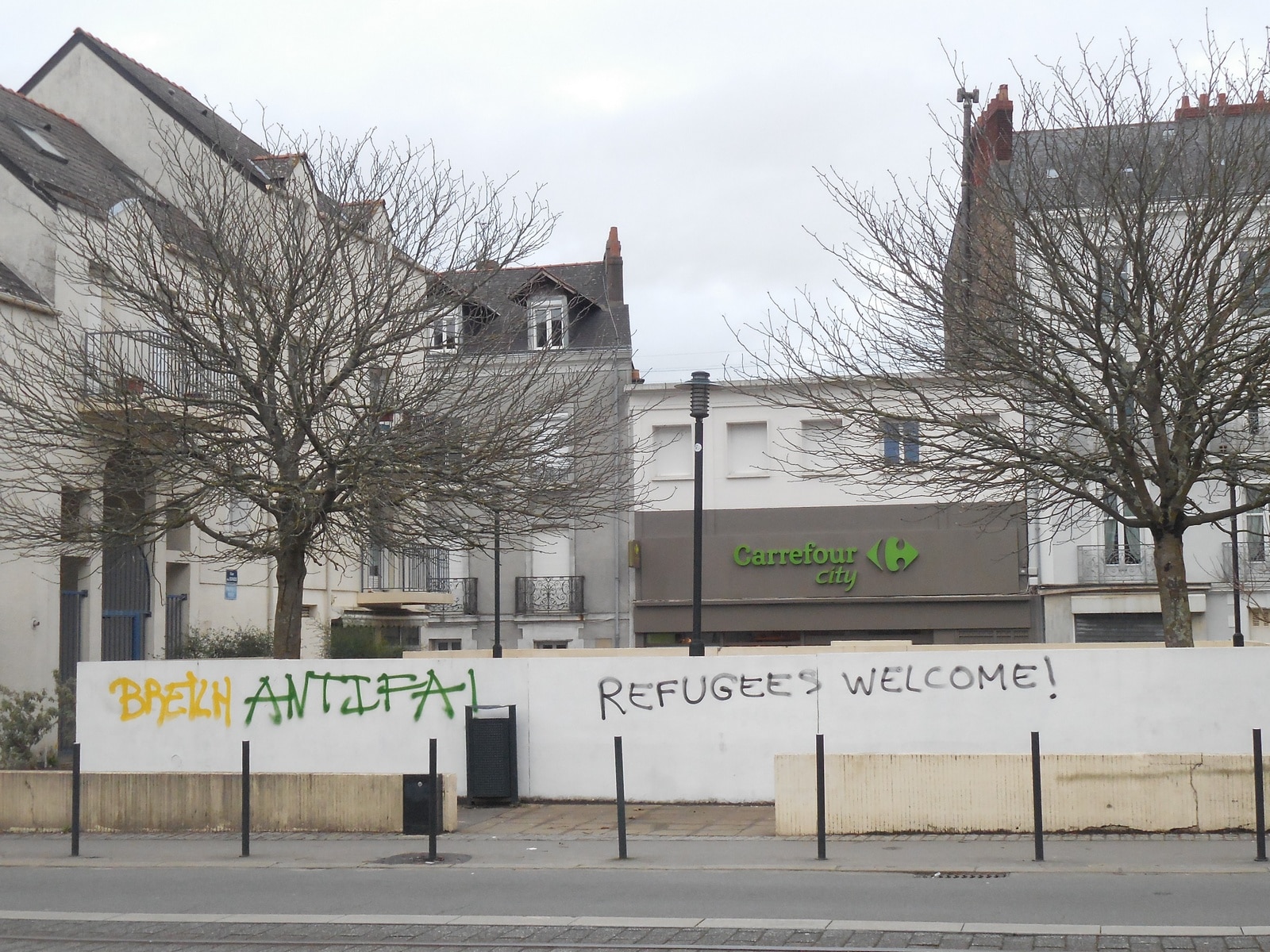 Le cortège remonte la rue du Poitou, le long du tramway, des tags recouvriront murs et stations de trams – les trois stations Viarme, Poitou et Félix Faure seront abondamment taguées avec des A cerclés et des ACAB (all cops are bastards). Les antifas braillent à qui mieux mieux « Refugees welcome », « Nantes antiraciste », « pas de quartiers pour les fachos » et autres classiques du genre. Un tag refugee Welcome est inscrit sur un mur au milieu des « Nantes antifa » et autres ACAB. Un quart d’heure plus tard, la tête de la manif tourne dans la très bourgeoise rue du Maine.