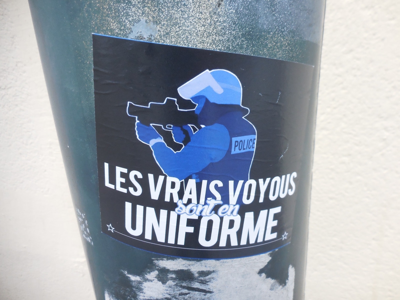 Les manifestants contournent par la petite rue Joyau, renonçant à passer par l’intérieur de l’îlot. Les tagueurs continuent leur travail artistique, animés d’un inextinguible amour pour la police : « Kill cops » à l’angle des rues Joyau et Daudet. Devant Saint-Pasquier, la BAC barre l’accès à la rue Villebois Mareuil.
