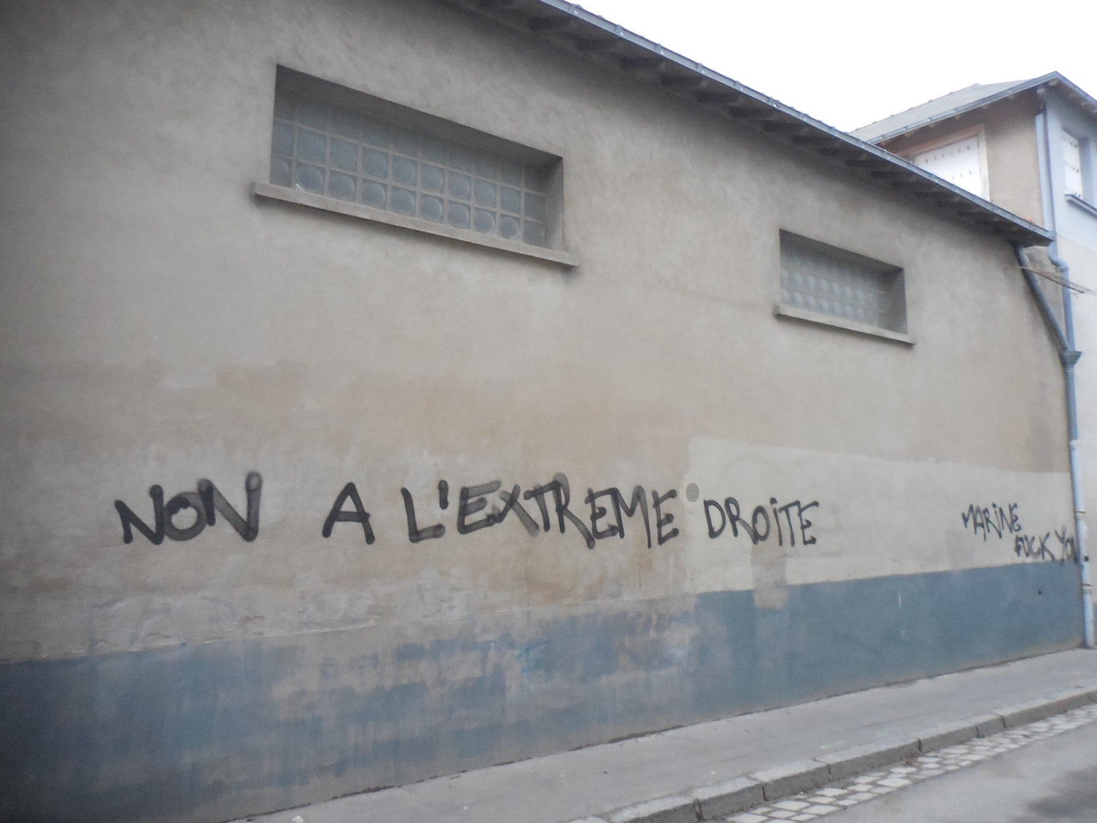 Pendant ce temps, d’autres manifestants s’en sont pris au couvent des Clarisses, rue de Haute Roche, au sud de la salle Bretagne, en taguant «Non à l’extrême-droite », « Refugees Welcome » et « Marine Fuck You » sur le long mur aveugle, et brisé une vitre de la maison de retraite en chantier, juste en face. Un riverain regarde, peiné : «Faut vraiment être con pour taguer ici : chez les Clarisses, la moitié des sœurs viennent d’Afrique noire. L’irreligion, ça rend vraiment con ».