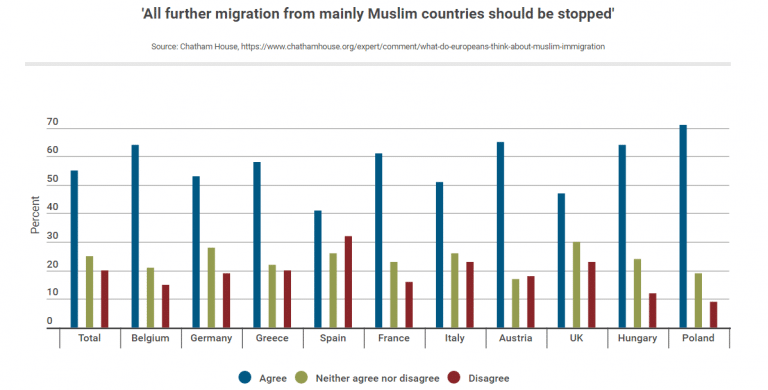 Les résultats sont clairs. 55 % des Européens s’opposent à l’immigration provenant de pays musulmans quand seulement 25 % d’entre eux s’opposent à un arrêt total.