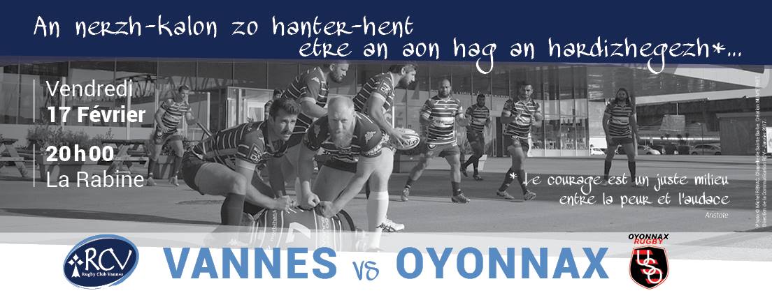 17/02/2017 – 10H00 Vannes (Breizh-info.com) – Le RC Vannes reçoit Oyonnax, leader de pro D2, ce vendredi soir à La Rabine. Et ce soir, il ne faudra pas faire de quartier, ni de complexe d’infériorité, face à une machine à gagner qui rêve de retrouver dès la saison prochaine le Top 14.  A noter que la rencontre sera suivi depuis les tribunes par le Président de la Fédération Française de Rugby (FFR), Bernard Laporte qui au préalable, aura rencontré les dirigeants du club qui lui auront fait la promotion de la création d’un pôle rugby élite dans le Morbihan.