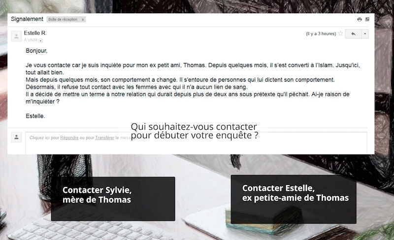 Vous devrez empêcher Thomas (21 ans), Rachid (29 ans), Moussa (22 ans) et Marion (16 ans) de se radicaliser, respectivement à Dinan, Paris, Fréjus et Marseille. La carte d’identité de chacun d’entre eux vous sera donnée dès la première étape du jeu. Et durant l’enquête, vous pourrez déceler les signes de radicalisation avant qu’il ne soit trop tard, avant que le personnage ne commette un acte irréparable.