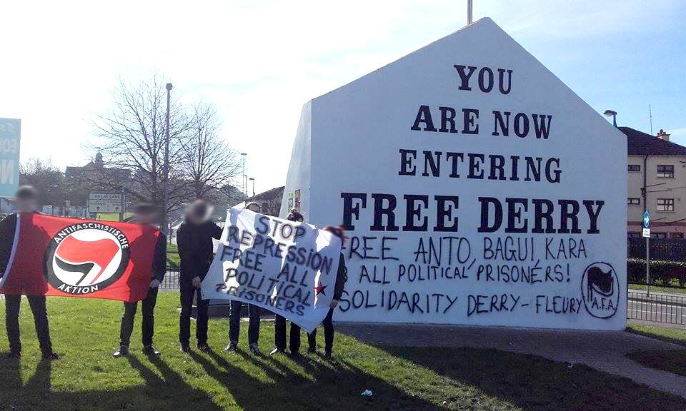 La fameuse peinture « you are now entering free Derry » a en effet été complété par un tag – qui plus est particulièrement hideux – sur lequel on pouvait lire « Free Anto, Bagui, Kara, all politicals prisoners ! Solidarity Derry – Fleury ».