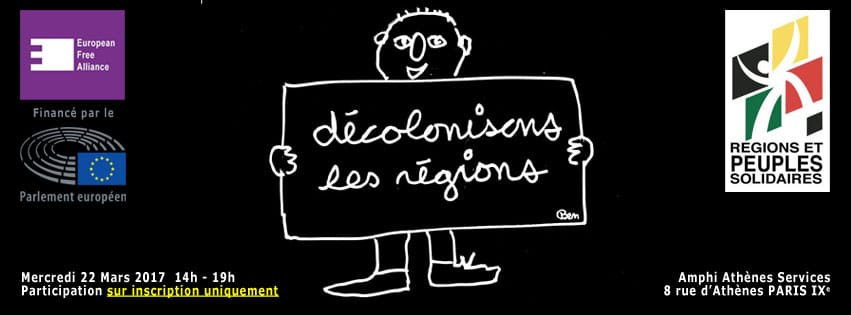 19/03/2017 – 09H15 Paris (Breizh-info.com) – Une conférence sur le thème « décolonisons les régions » se tiendra le 22 mars à Paris. Amphi Athènes service, rue d’Athènes à Paris. Un colloque financé par le Parlement Européen, à l’initiative d’European Free Alliance et de Régions et peuples solidaires. Un car partira au départ de Bretagne.