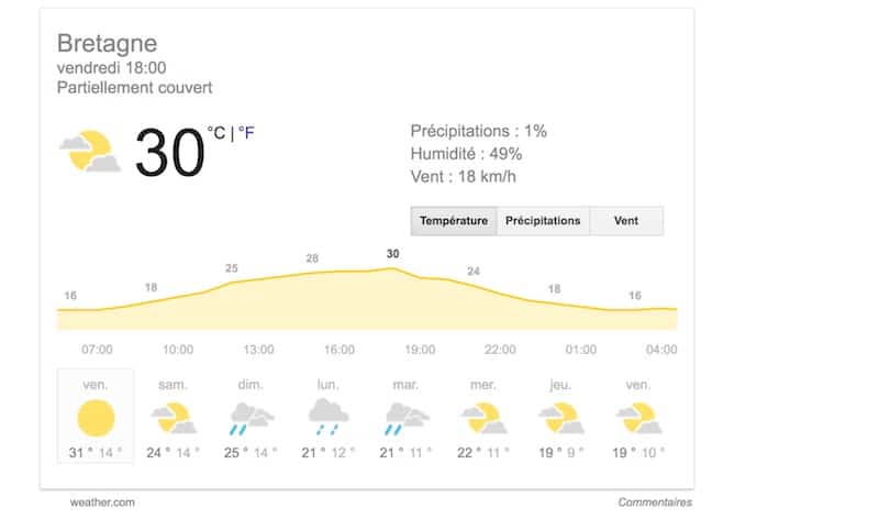 Et à partir de 11h, jusque 18H, cela ne s’arrêtera pas de grimper : les températures vont se rapprocher des records d’une fin mai et atteindront les 31 degrés à Nantes, 30° à Rennes et Port Navalo, 29° à Cancale et Carhaix, 27 à Brest, 24 à Bréhat et 22 à Ouessant.