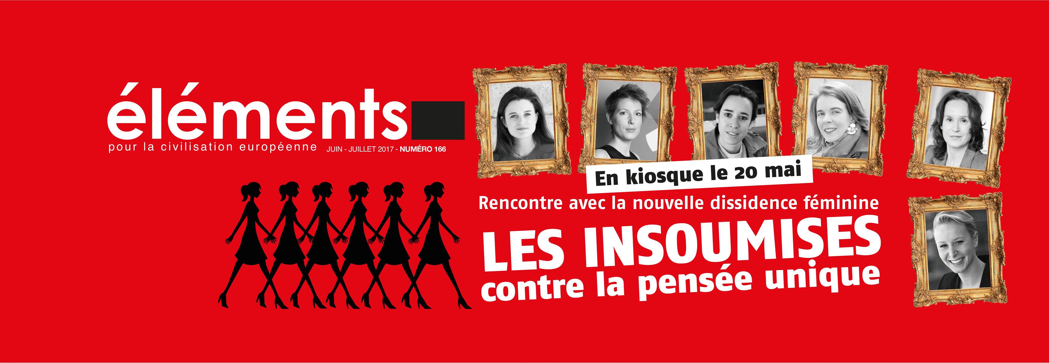 Le numéro 166 de l’excellente revue Éléments est sorti, avec pour thème central ce mois-ci : « Des insoumises contre la pensée unique ». En voici ci-dessous l’éditorial ainsi que le sommaire.