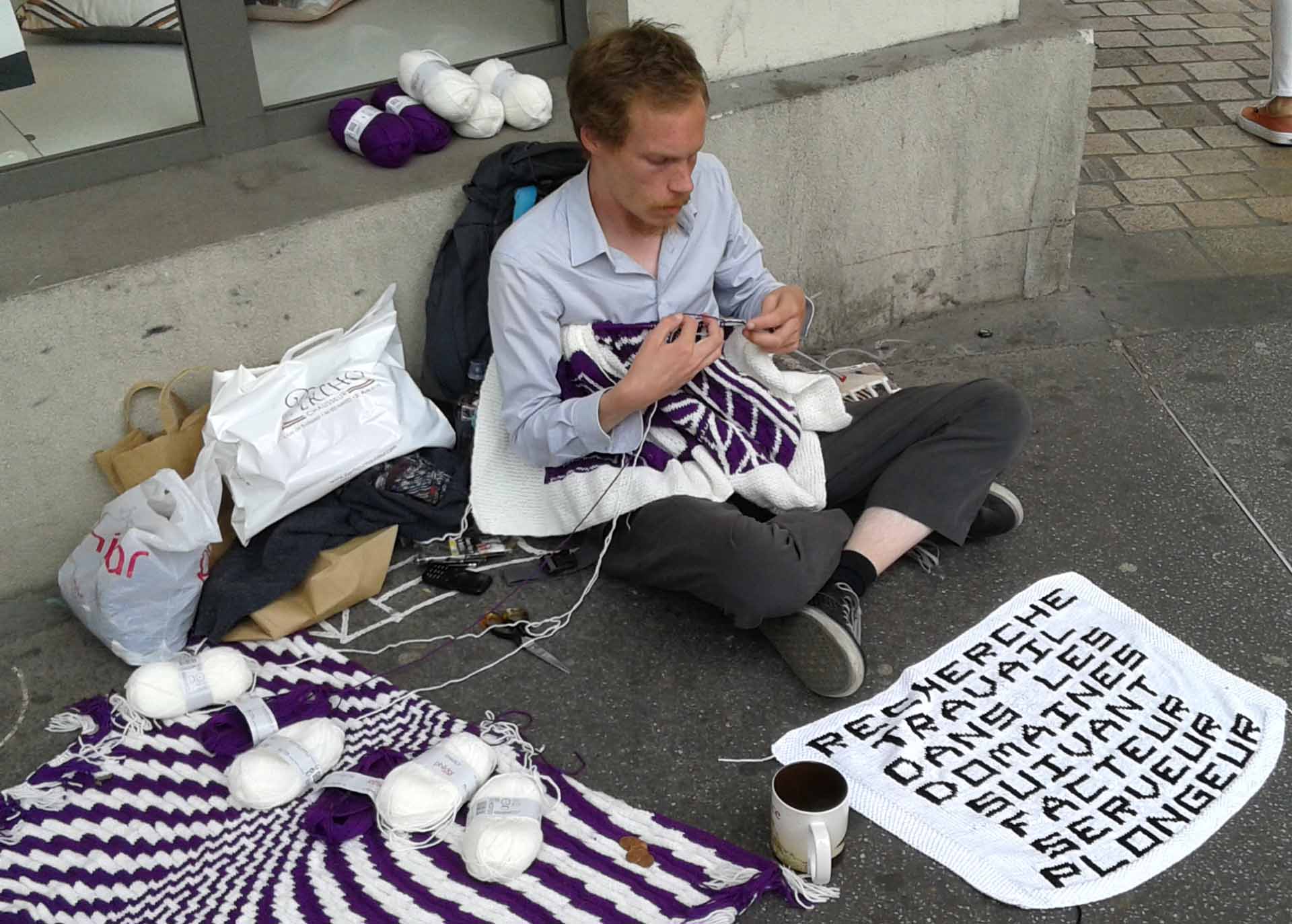 Jérôme est à la rue depuis 2010, après des études dans l’hôtellerie-restauration. Il a aujourd’hui 27 ans. Né à Nantes, il est français de souche. « J’ai commencé à tricoter quand je n’étais pas encore SDF, j’étais alors pâtissier et plongeur. C’était d’abord comme un défi, comme un coup de folie. Quand je me suis retrouvé à la rue, j’ai continué ».