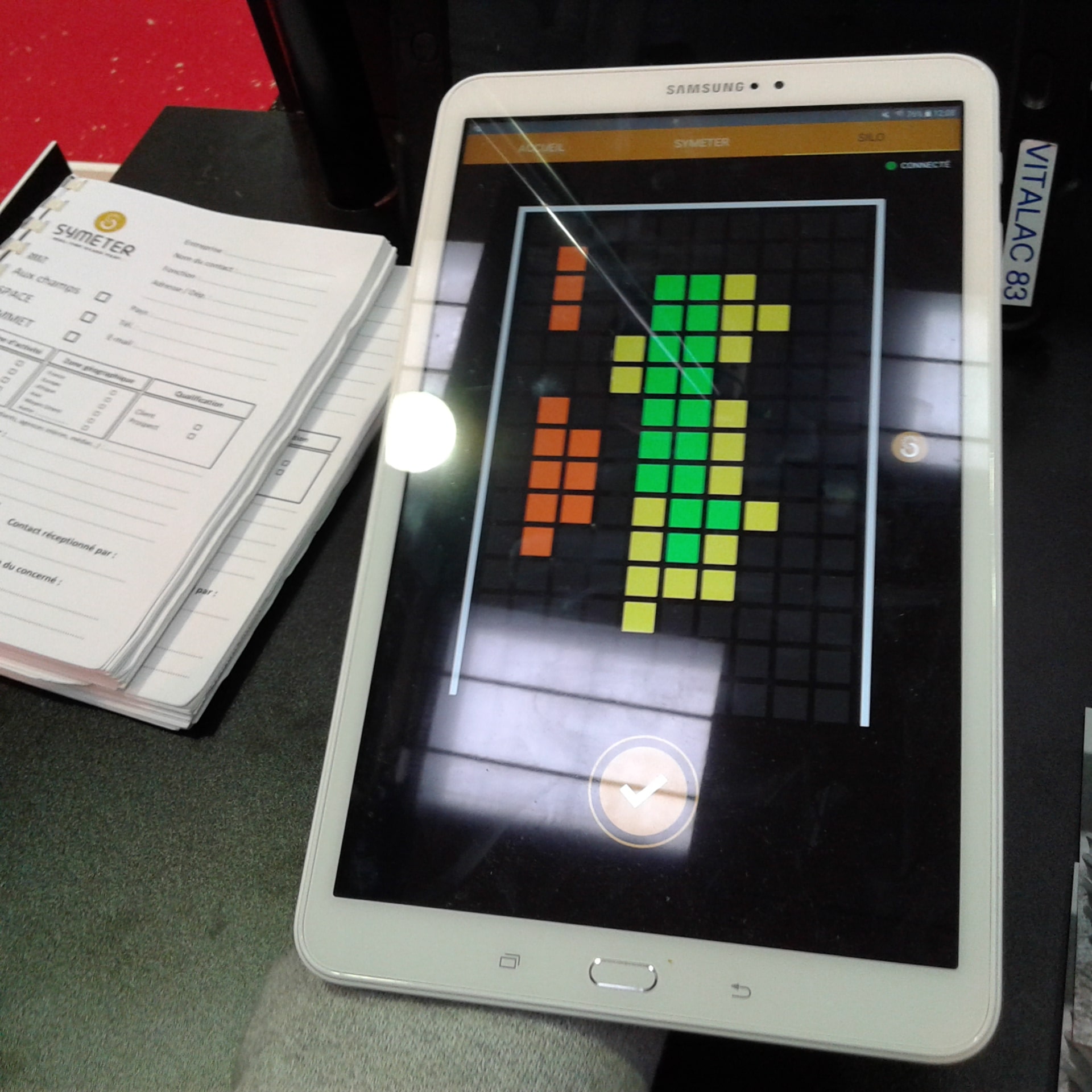 Symeter permet de suivre en temps réel l’évolution du tassage dans le silo, remorque après remorque. L’outil est constitué d’une tête de lecture perchée sur un mat, au-dessus du silo, avec un retour sur tablette. Le silo est divisé en petites zones carrées, cartographiées par couleurs : en vert c’est bien tassé, en jaune c’est en cours, en rouge le tassage est insuffisant, à reprendre.
