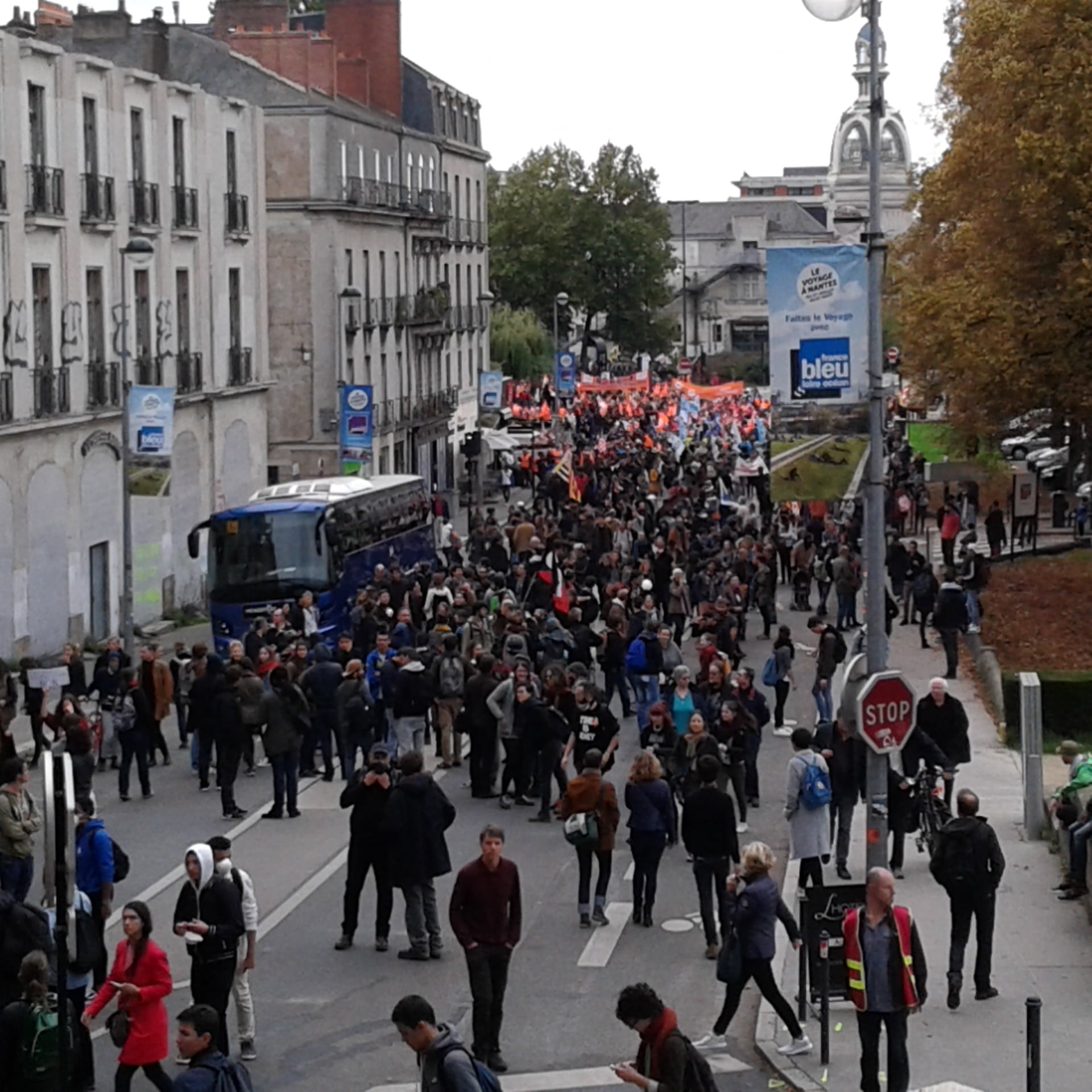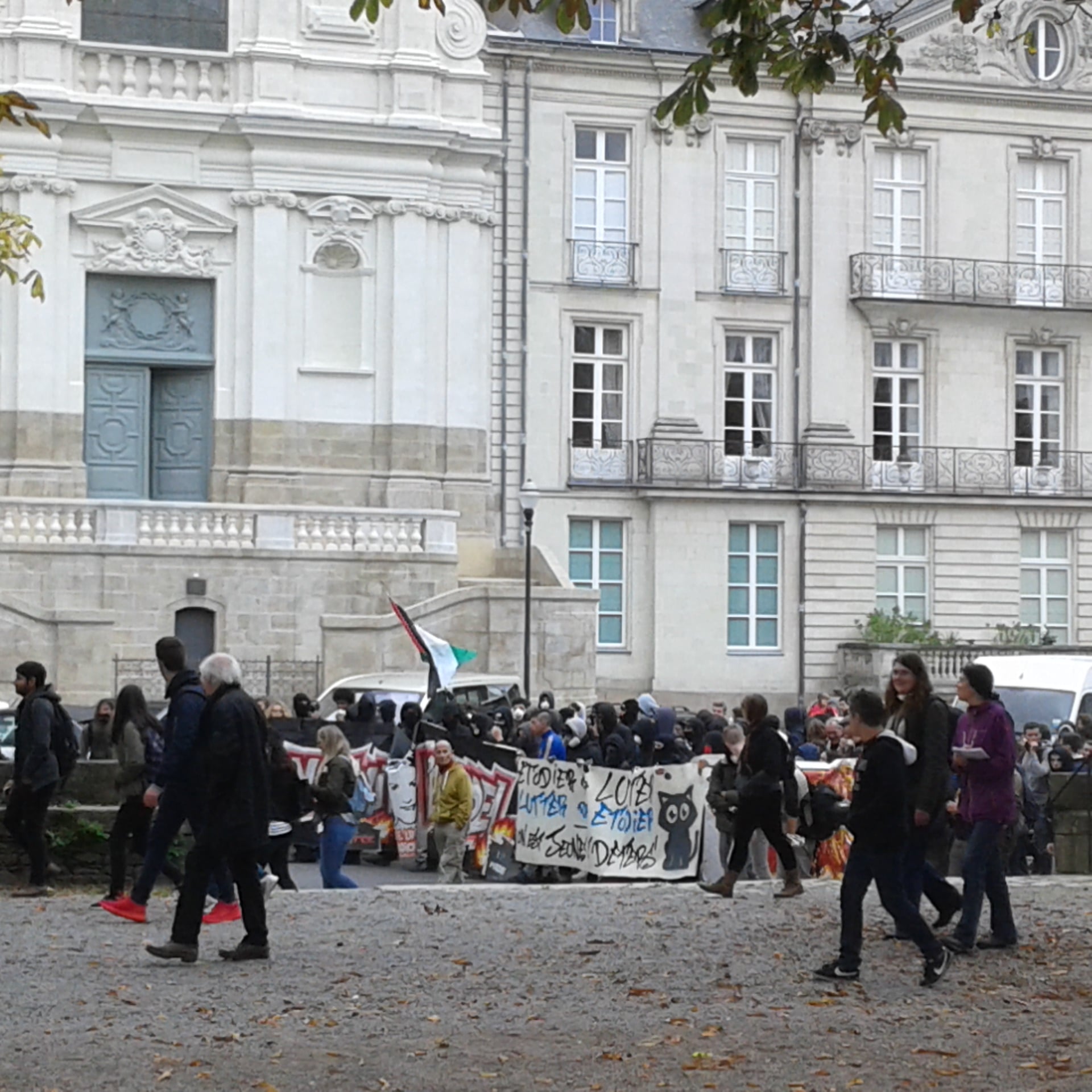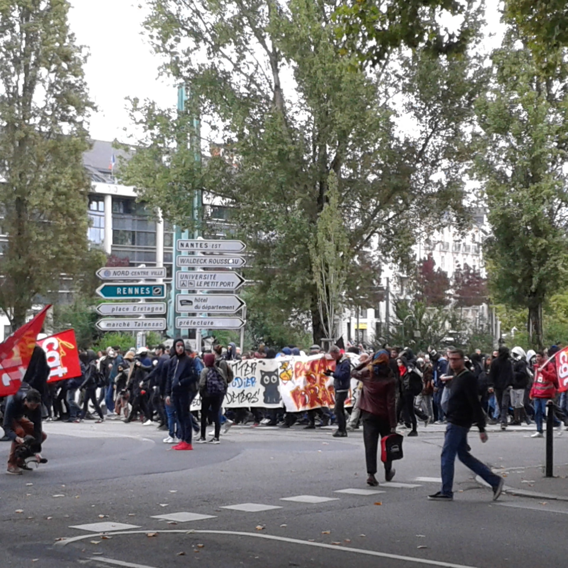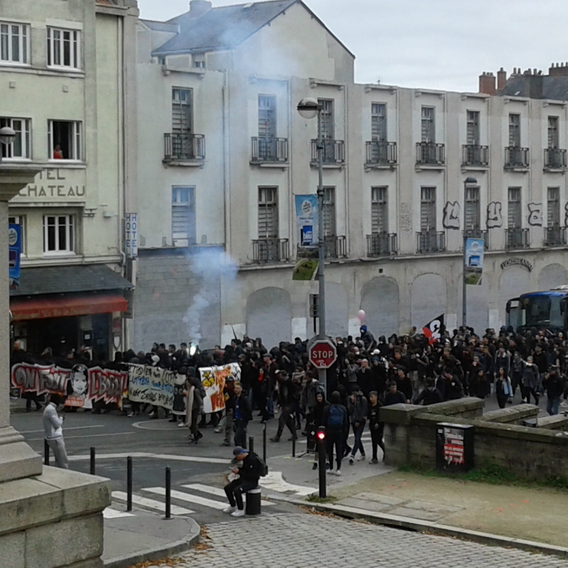 La manifestation nantaise s’est à nouveau illustrée par divers tags cours Saint-Pierre et sur la Préfecture, tels que « La BAC au bûcher », MEDEFesnestrons les patrons »et autres « un commissariat qui brûle c’est de l’art ». Un black block de 150 personnes ouvrait le cortège derrière une banderole qui avait le mérite de la sincérité « on fout le bordel »