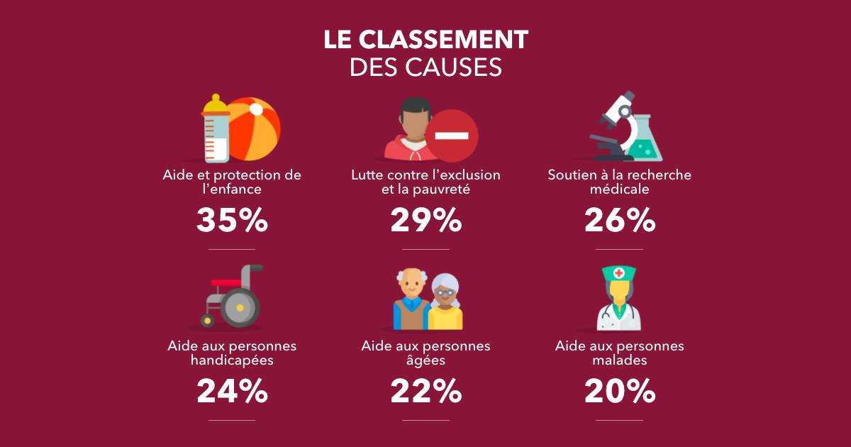 Le top 3 des causes les plus plébiscitées réside dans  l’aide et la protection de l’enfance plébiscitée par 35% des Français (vs 39% en 2016), la lutte contre l’exclusion et la pauvreté (29% comme en 2016) qui prend la deuxième place et la recherche médicale (26% vs 30% en 2016). L’aide aux personnes handicapées arrive juste derrière avec 24%, 22% pour l’aide aux personnes âgées et 20% pour l’aide aux personnes malades.