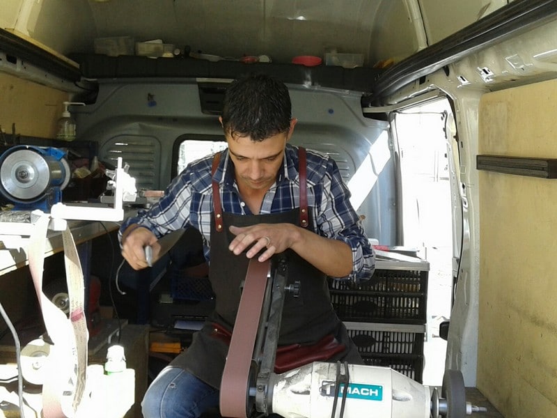 Avec sa camionnette-atelier, il se déplace et s’occupe de nombreux corps de métiers. Ainsi, il affute les ciseaux de chirurgie pour les élèves du CHU, de la cuisine centrale municipale, les outils de certaines fermes, les tondeuses de centres équestres (15€), les lames de scie circulaire (de 10 à 43€), les gouges des menuisiers et ébénistes (3€), les ciseaux à bois (de 3 à 5€), les ciseaux de coiffure donc (32€), les ciseaux de couturière ou de tapissier (de 6 à 10€ selon la taille), les haches (7€), les lames de tondeuses à gazon (10€) et donc les outils de cuisine. « Il y a un réel besoin d’affûtage, tout le monde a des outils tranchants. Après, y en a qui savent affûter mais ça ne tient pas, c’est un fusil à un coup», constate Daniel Da Silva, « moi ça m’intéresse qu’on me dise trois ou quatre mois après, ton affûtage il tient, c’est du bon travail ».