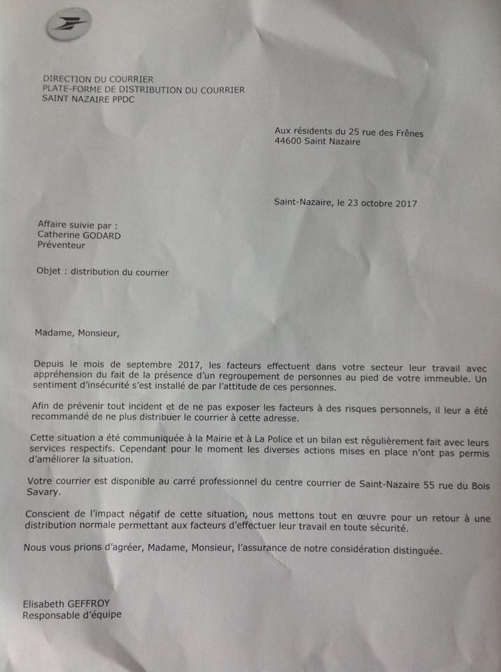 Dans une lettre adressée le 23 octobre dernier aux résidents, la direction du courrier de la plateforme de La Poste de St-Nazaire explique : « depuis le mois de septembre 2017, les facteurs effectuent leur travail dans votre secteur avec appréhension du fait d’un regroupement de personnes au pied de votre immeuble. Un sentiment d’insécurité s’est installé par l’attitude de ces personnes ».