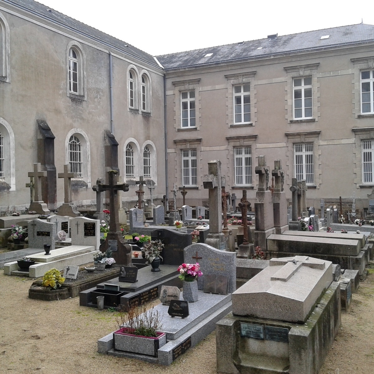 Il y a quelques tombes religieuses, dont celle des Jésuites – un grand bloc solide et secret. Celle des religieuses de Notre-Dame de Charité, « fondation à Nantes 1809 » en bon état général et qui comporte – fait rare pour des tombes religieuses, si ce n’est dans un cimetière dédié comme celui de l’abbaye de Saint-Gildas des Bois – une liste complète des sœurs enterrées avec leurs dates de naissance et de décès. Ou encore celle – bien moins entretenue – des Frères des Ecoles chrétiennes, avec une plaque par frère enterré sous les deux croix.