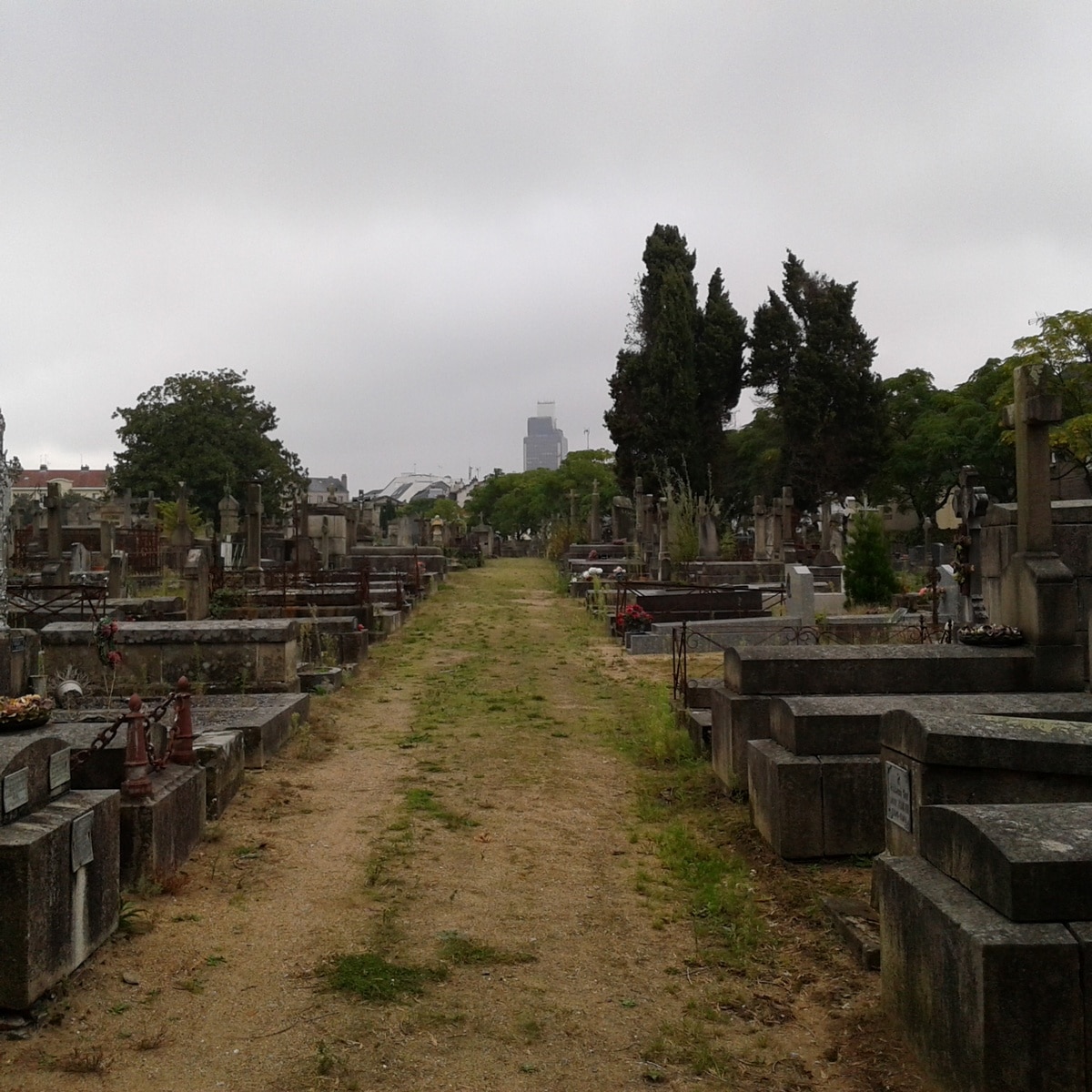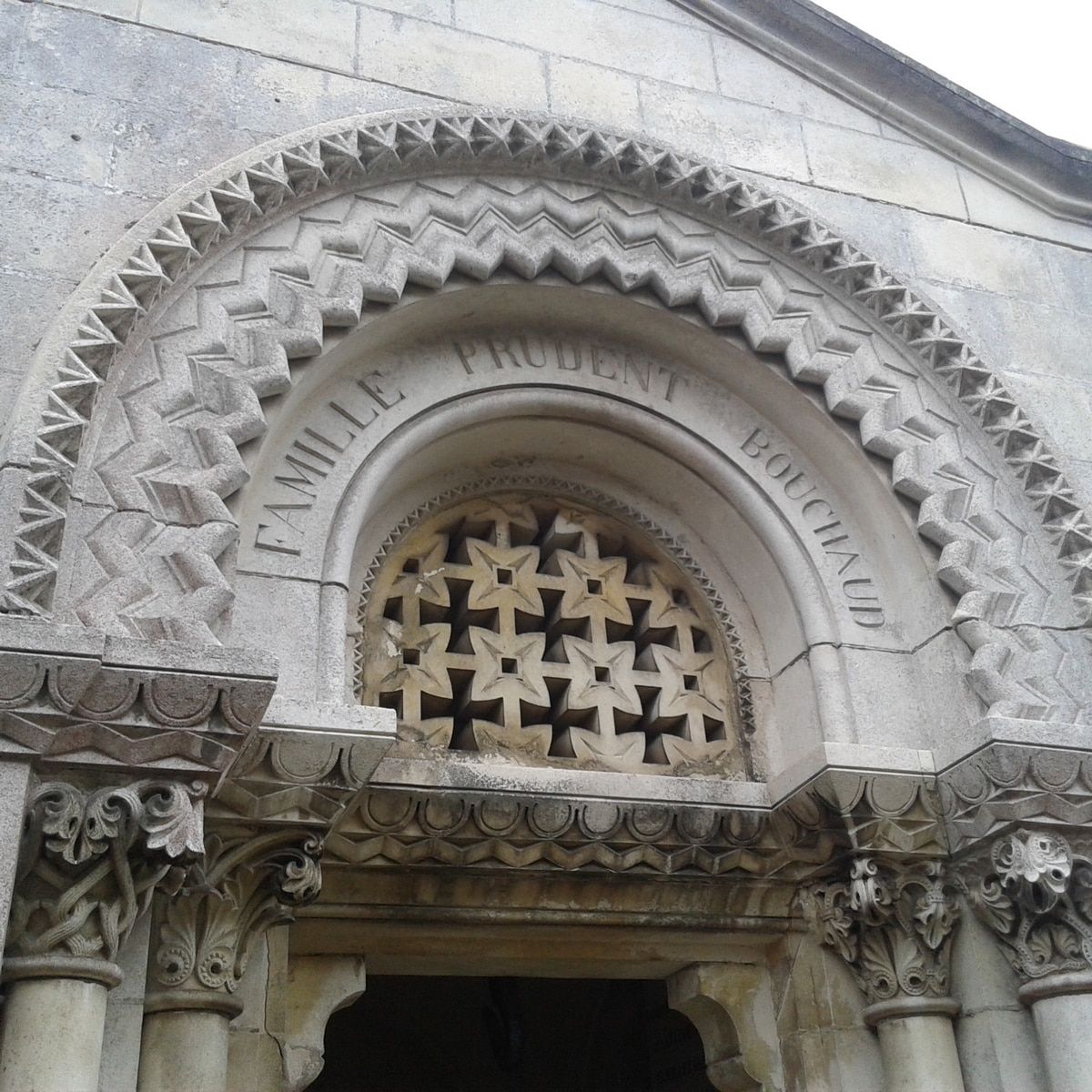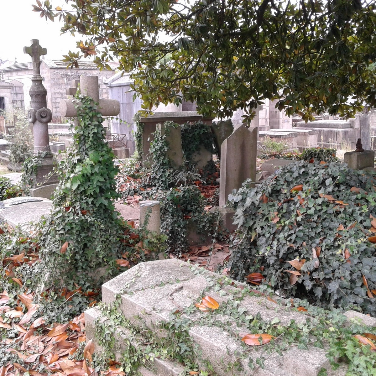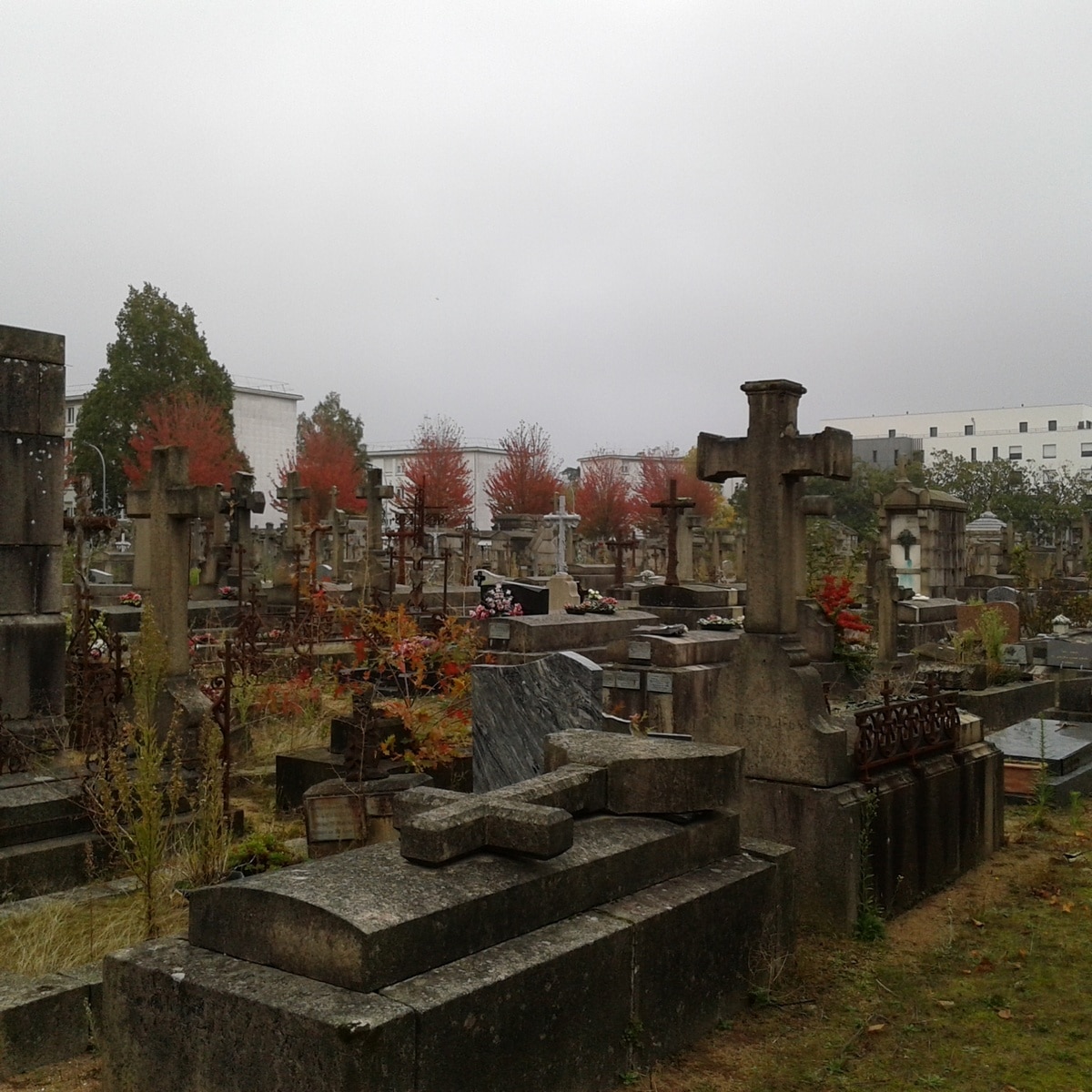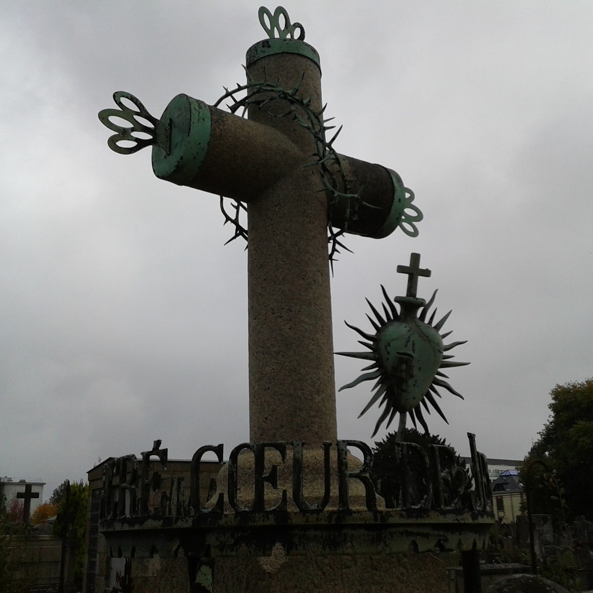 En revanche, les tombes historiques tout autour – nous sommes dans la partie historique du cimetière, la plus ancienne – non. Le long de la clôture, une partie vraiment embroussaillée est à l’abandon, encerclée par des barrières de chantier. Des champignons s’en donnent à cœur joie sur la terre grasse. Là encore, beaucoup de chapelles funéraires sont délaissées par leurs familles. Certaines sont magnifiques – l’une d’elle est néogothique, l’autre rappelle un enfeu Renaissance, comme il y en avait nichés dans le mur gallo-romain aux Cordeliers. Un autre encore est sous-terrain, on y accède par un escalier. Les croix forgées ou découpées sur les portes font admirer l’art funéraire du XIXe siècle, dans son immense variété.