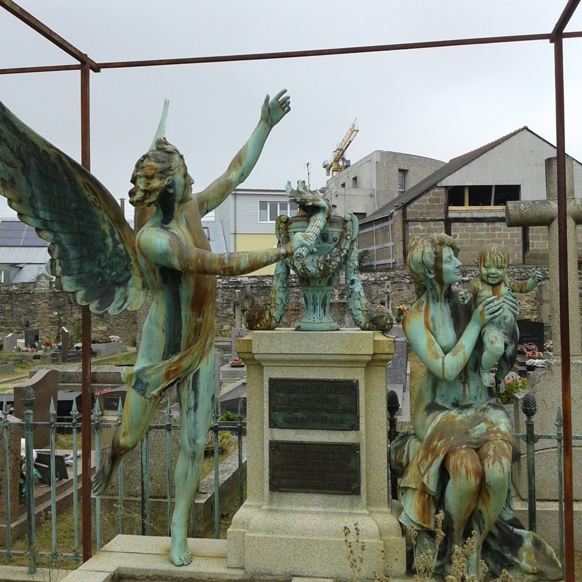 Il est précisé qu’une « grande partie du cimetière ne fait plus l’objet de traitement chimique depuis 2014 ». Le mot chimique est en trop. Une grande partie du cimetière ne fait plus l’objet de traitement du tout et la nature y reprend ses droits. Sur une tombe transformée en carré de verdure, des bouteilles en plastique (pour l’arrosage?) traînent en tas. Un caniveau sous une borne à eau est bouché par les feuilles. Le lierre qui recouvre une tombe d’un édredon vert déborde dans tout le carré. Les anges d’Horace Daillion qui ornent la belle tombe d’Aristide David sont plus que largement dévernis.