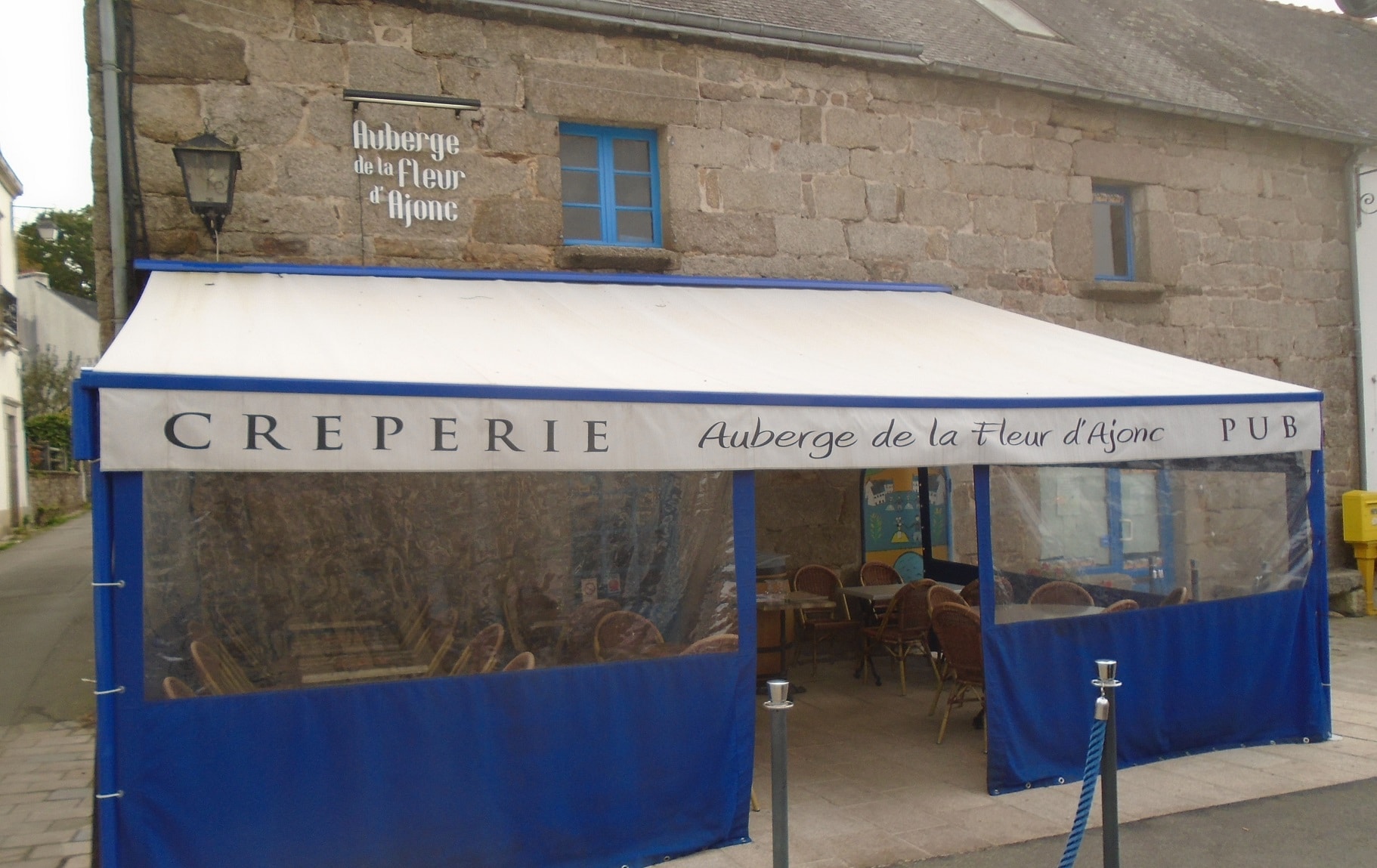 Auberge de la Fleur d’ajonc ! Le nom, déjà, fleure bon son tradi (sans être très original pourtant puisque l’établissement d’à côté s’appelle restaurant des Ajoncs d’or). Vu de dehors, cependant, l’endroit ne paie vraiment pas de mine. De dedans moins encore : décoration minimaliste, éclairage chiche et orientation nord en font un antre sombre aux jours gris.