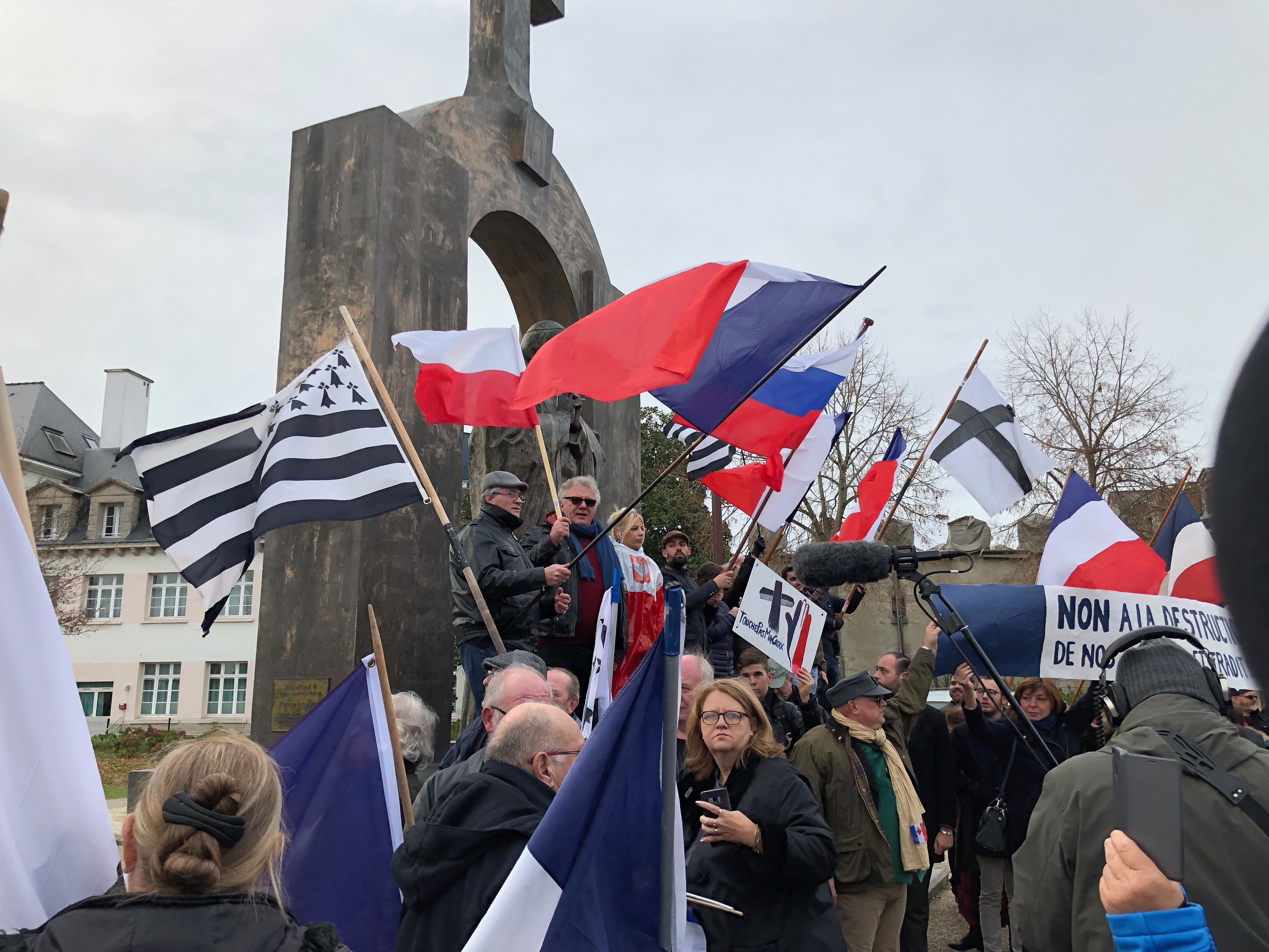 C’est compter large. Cette manifestation est un échec. L’église la première concernée était absente (la masse de ses fidèles aussi) elle a mieux à faire avec les « migrants ». On eut un petit rassemblement de droite radicale, bretonne et française :FN, UNI, Parti de la France (sic) SIEL… Même les différents groupes tradis n’étaient pas là. Jean-Paul II ne doit pas vraiment être en odeur de sainteté pour eux. C’est une image de la déchristiannisation qui touche aussi la Bretagne. On n’est plus en 1905.