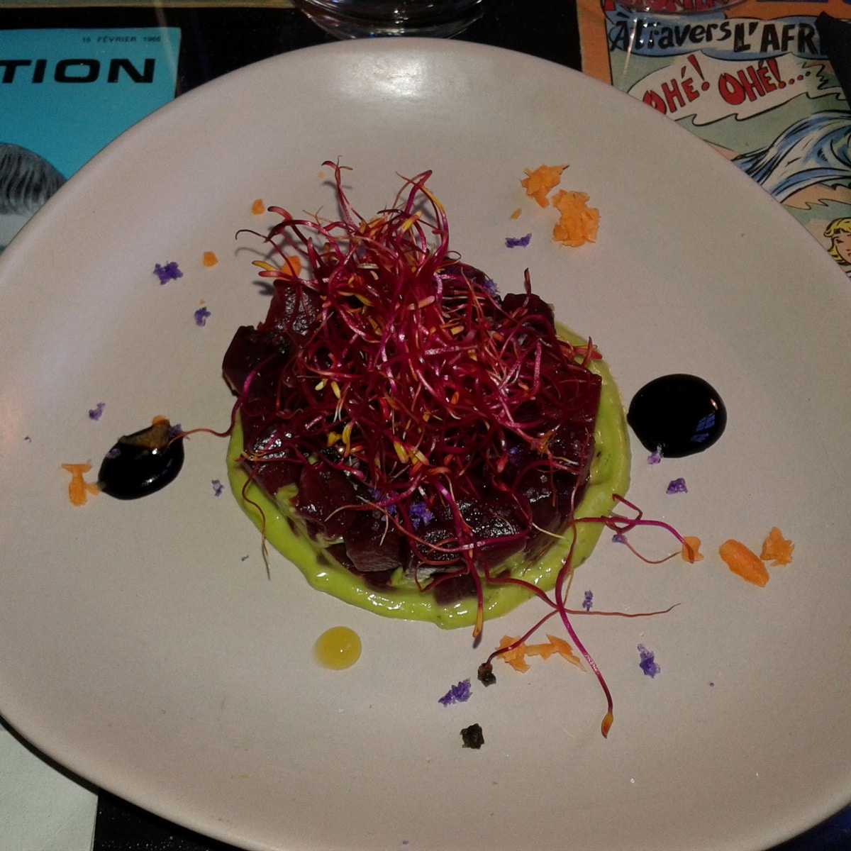 Bref, à midi, le 2 rue des Dames propose une formule à 17 € avec un choix entre deux entrées, deux plats, deux desserts. Ce midi, ce fut donc un tartare avec une crème d’avocats – le vrai comble du juge – hérissé de pousses de betteraves et saupoudré généreusement de fleur de sel, un merlu bien nacré pêché la nuit même au Guilvinec, et une panna cotta absolument savoureuse. Pour 2.50 € de plus on a un verre de vin rouge ou blanc – ou un pichet de 50 cl à 8 €, assez rare pour être signalé. Le plat seul est à 9€.