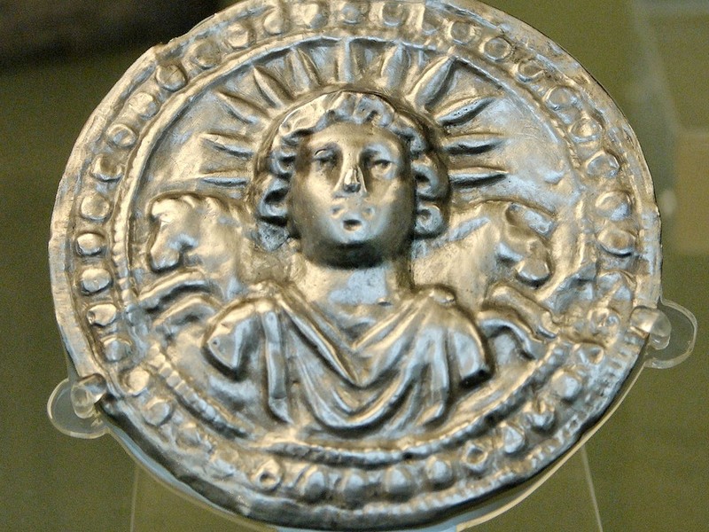 Illustration : disque dédié à Sol Invictus portant la couronne radiée, argent, œuvre romaine, IIIe siècle. Provenance : Pessinus (Bala-Hissar, Asie mineure) (Wikipedia)