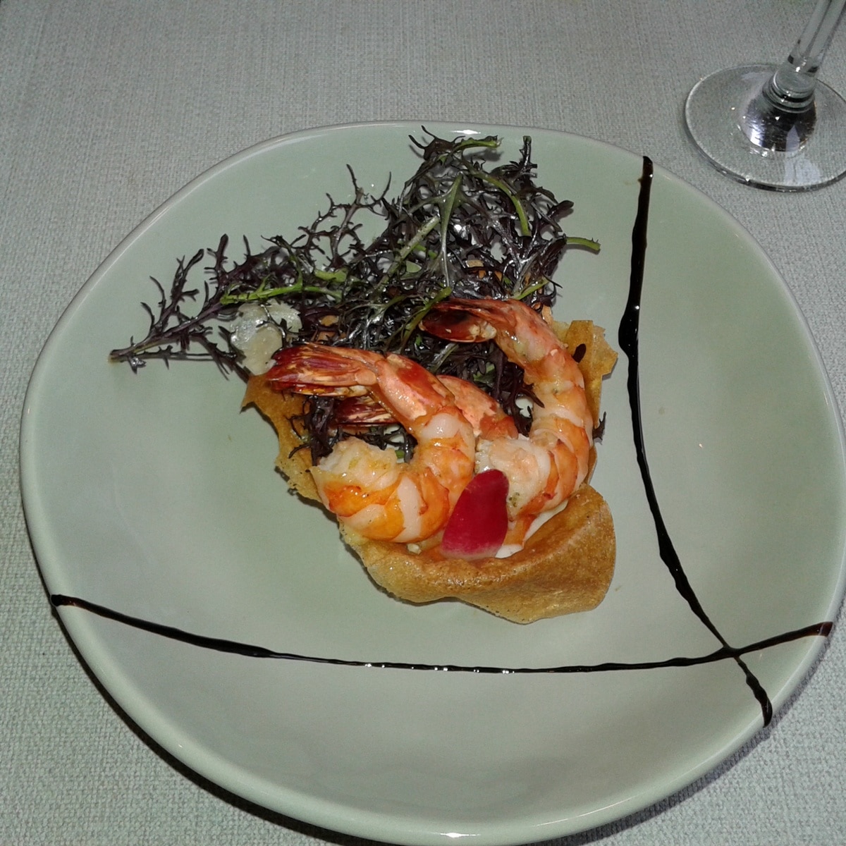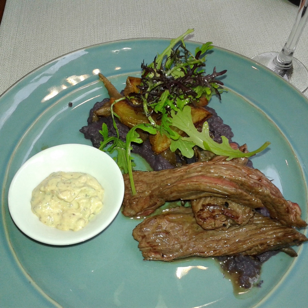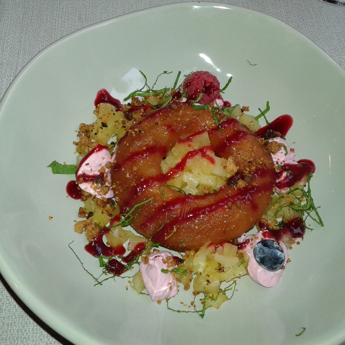 Au menu ce jour, une tartelette de crémeux de parmesan avec des crevettes chaudes, une bavette à la sauce gribiche – avec pommes de terre frites et purée de choux rouges – et un dessert très fruité constitué d’un gâteau à la noix de coco, d’un tartare d’ananas et d’une crème fouettée aux fruits rouges. Un grand soin est apporté à la présentation des assiettes, aux saveurs, aux portions – qui ne sont pas très copieuses mais bien suffisantes.