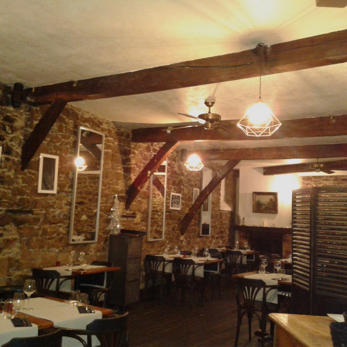 En semaine, on y trouve le plat du jour à 10.90 €, la formule complète à 18.90 € ; la formule à la carte est à 26.80€. Pas de vin abordable au pichet – mais une demi-bouteille de Chinon rouge (Les Galets) correct est à 14€. Pierres apparentes aux murs, poutres, l’accueil est à l’étage dans une salle aux allures de grange. Généralement, le midi on mange en bas, dans la petite salle à l’entrée ; dans l’escalier, l’arrière-grand père de la patronne veille sur les passages d’un regard tranquille, la poitrine glorieuse de décorations.