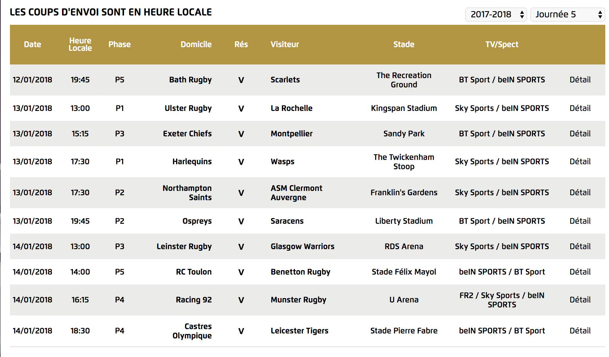 Poule 4 : Edimbourg est largement en tête, et reçoit le stade français, deuxième. Match sans aucun intérêt entre London Irish et Krasny Yar. Deux victoires à domicile, et bonifiées.