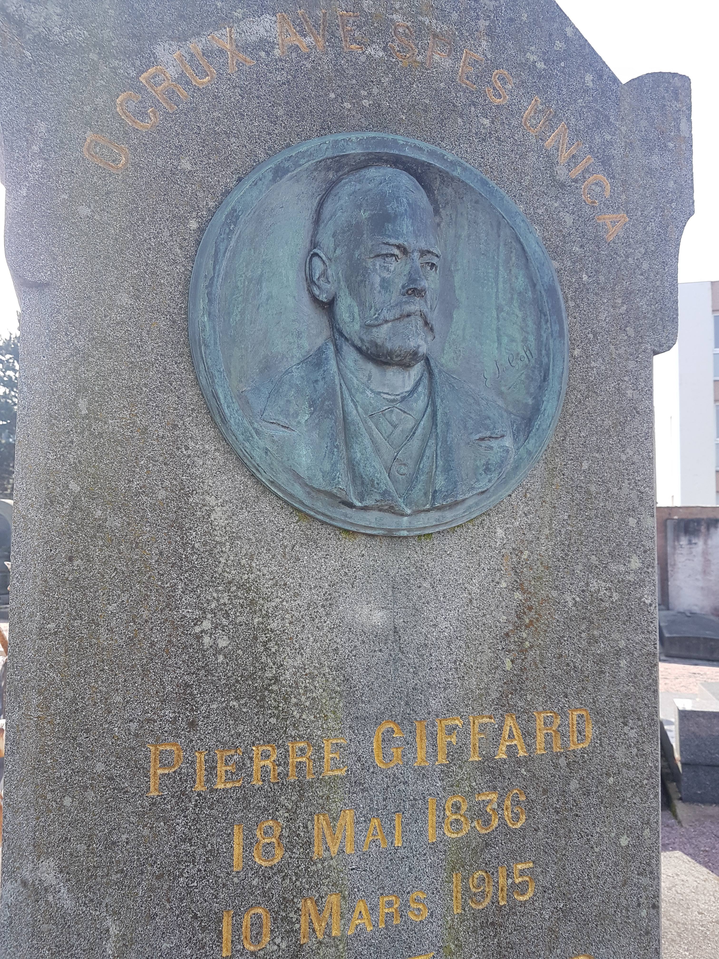 Lorsque le corps de ce troisième et dernier fils revient en Bretagne, c’est donc le père qui réalise le médaillon monumental en bronze du tombeau familial. L’on y voit les portraits des trois frères, surplombant un bas-relief en granit qui est une reprise d’une œuvre en plâtre de son fils Paul appelée « Funérailles bretonnes ». Y sont représentées trois générations de femmes, mère, veuve et orpheline, sortant d’une chapelle.