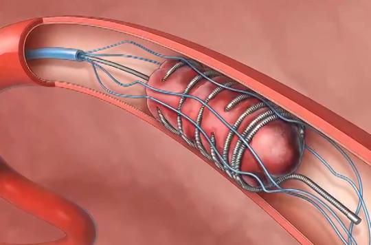 Voici ce qu’en dit le site allodocteurs : « On ne laisse pas le stent en place pour rouvrir l’artère, mais il est utilisé un peu comme un filet de pêche. On attend quelques secondes que le caillot se prenne dans les mailles du stent, et on retire ensuite l’ensemble. La circulation sanguine est alors rétablie. Pour le vérifier, il suffit de reprendre une photo des vaisseaux du cerveau. Le cerveau est à nouveau irrigué. »