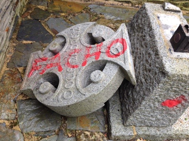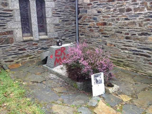 Croix celtique brisée, pierre tombale dégradée, tags « FTP » et « Fascistes dehors », la tombe de l’abbé Perrot à Scrignac, a été profanée. Les marches de La Chapelle ont aussi été taguées : « Pas de repos pour les merdes nazies ! ».