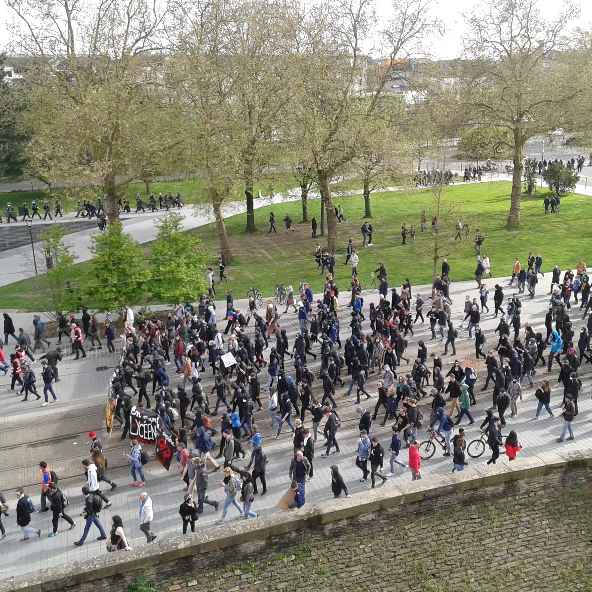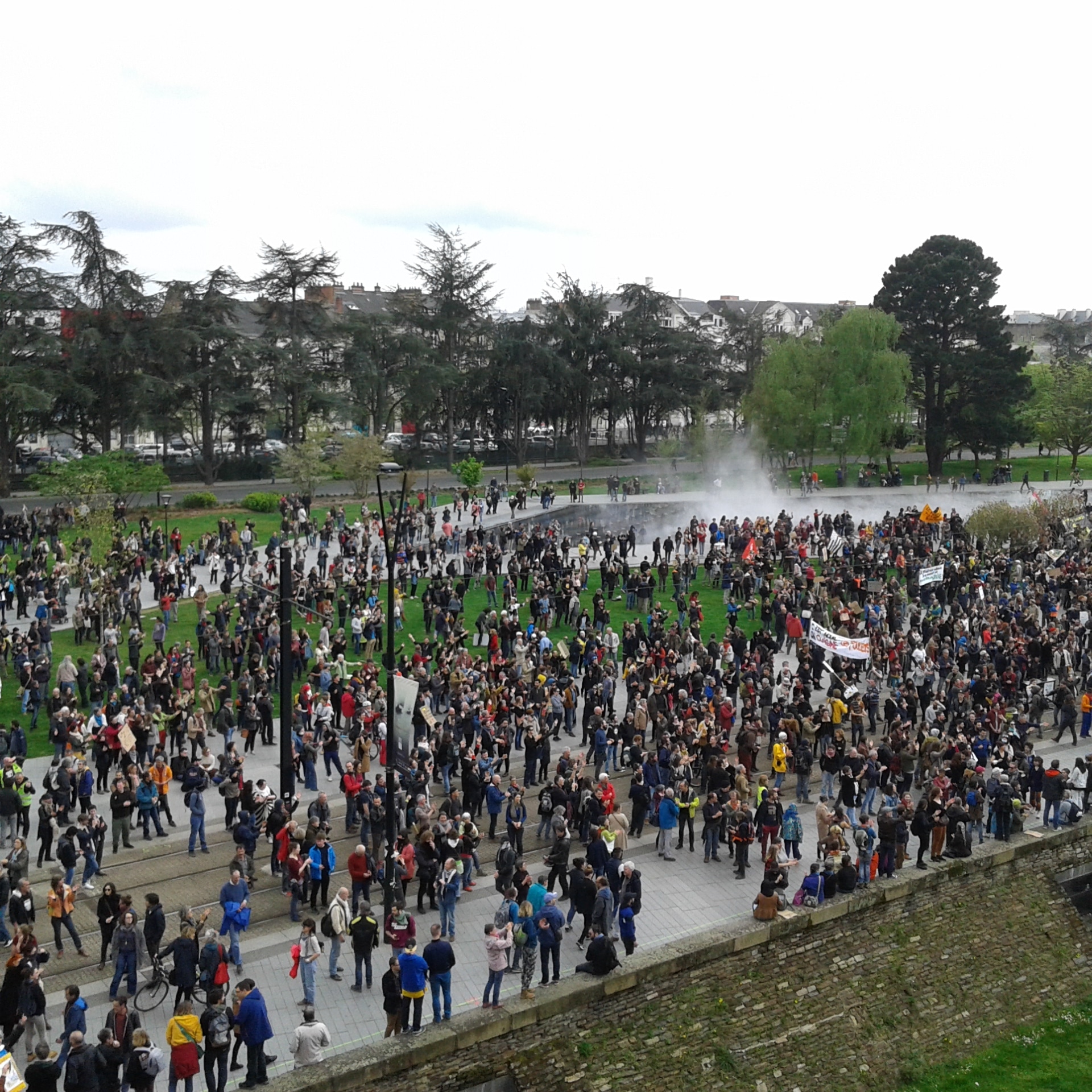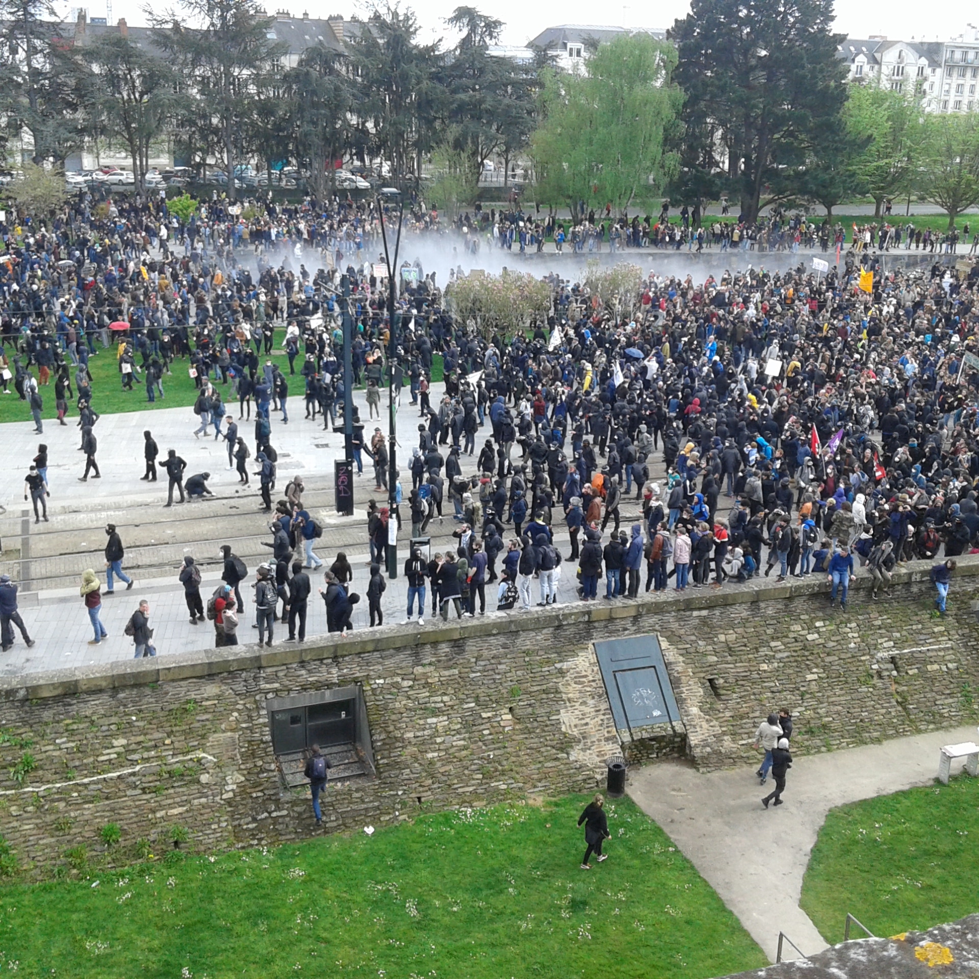 Partie de la croisée des tramways à 15h30, la manifestation syndicale – qui aurait regroupé jusqu’à 10.000 personnes (6700 selon la police) – se retrouve à la Préfecture où une allocution est prononcée vers 16h15 : « A partir du moment où des zadistes sont venus soutenir les luttes de la CGT, nous soutenons la lutte de Notre-Dame des Landes », explique un cégétiste au micro qui brocarde « la seule raison [de l’intervention de l’Etat sur la ZAD] la violence gratuite pour détruire. Ils ont démontré combien cet État était capable de détruire tout ce qui n’était pas dans leur cadre ».