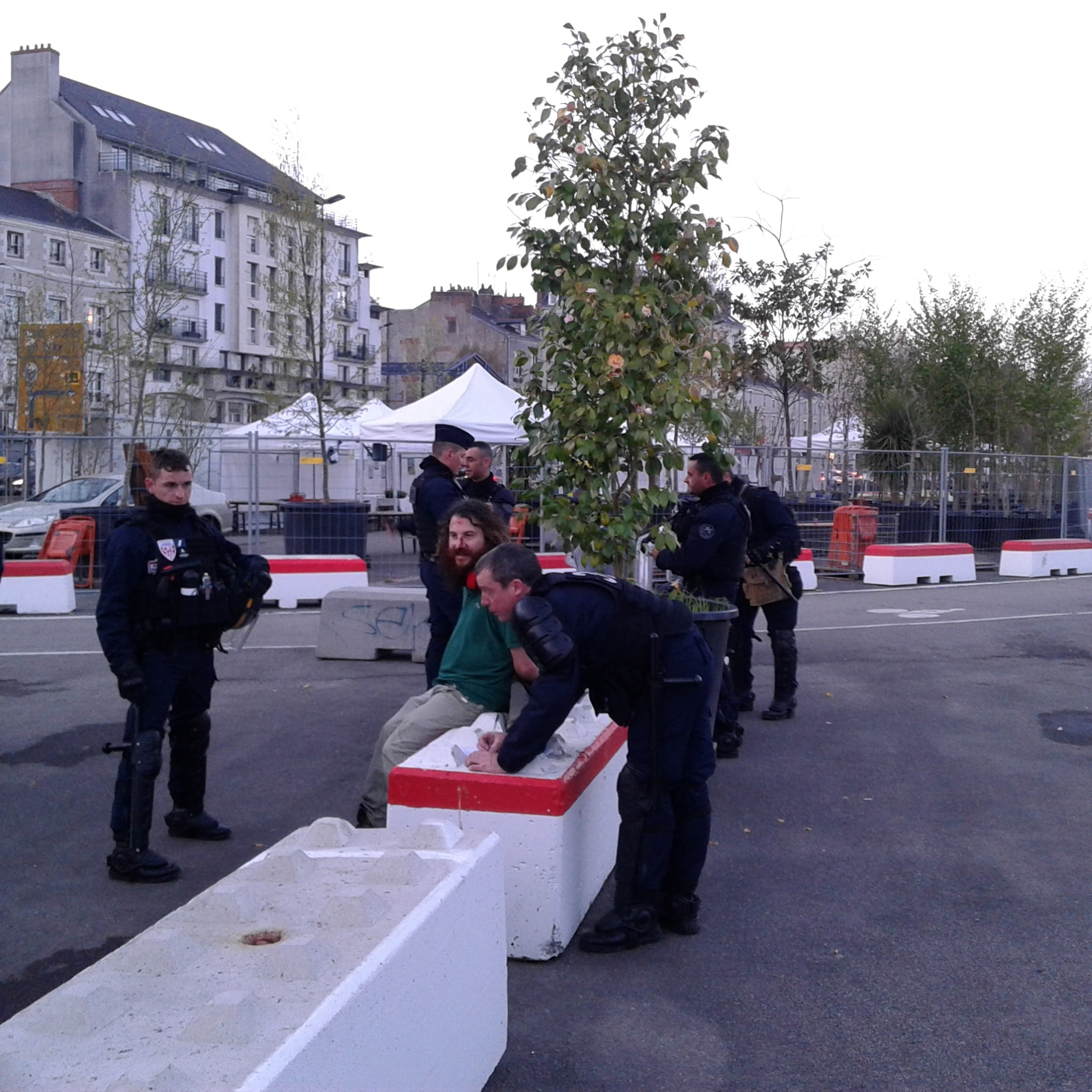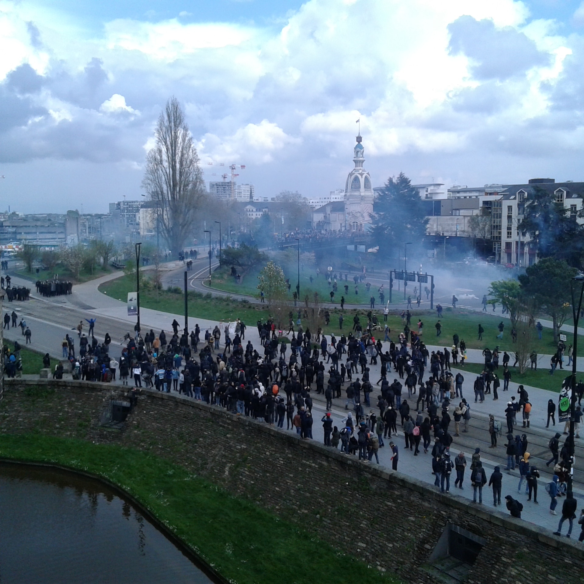 A l’avant des casseurs, outre des manifestants habitués des destructions et des violences contre les forces de l’ordre, l’on trouvait de nombreux individus jeunes, voire très jeunes (14 – 16 ans) qui se jetaient après plusieurs jets dans les douves pour sortir d’autres vêtements de leur sac et espérer tromper ainsi la vigilance des forces de l’ordre. Après avoir été peu à peu repoussés, ils se retrouvaient place Bouffay vers 18h30 où les heurts continuaient.
