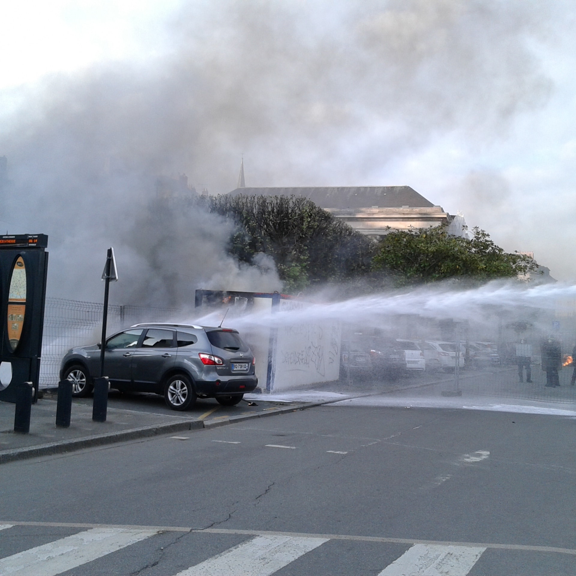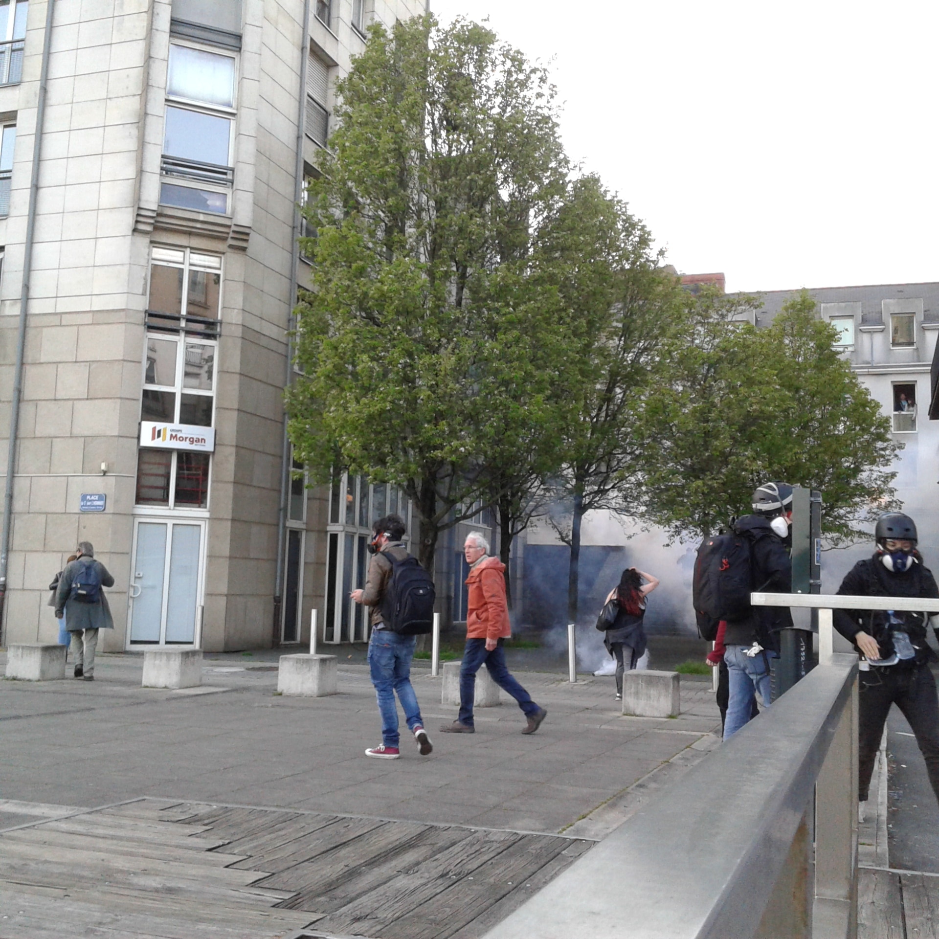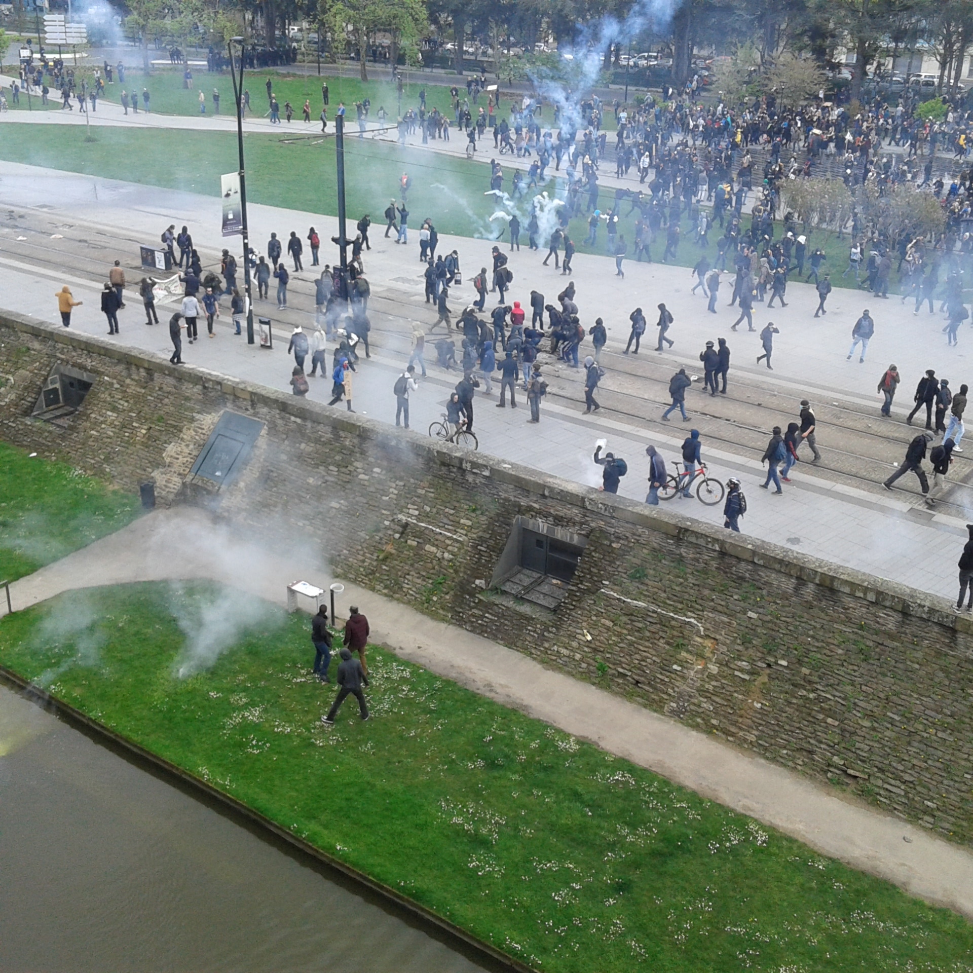 Repartis dans le même ordre, mais moins nombreux, les manifestants sont restés un long moment statiques Place du Cirque, avant de rejoindre la station Duchesse Anne à l’est du château à 17h30. Plusieurs charges ont alors été menées par le black block, à l’avant de la manifestation, dans l’objectif de rejoindre la gare. Repoussés à coups de gaz lacrymogène et de canon à eau par les CRS présents, les manifestants ont alors entrepris de dépaver systématiquement la voie de tramway – dont on se demande pourquoi elle est toujours en petits pavés alors que ce genre de dégradation est déjà arrivé à de nombreuses reprises, notamment en 2016 et 2017 – et de les balancer sur les CRS.