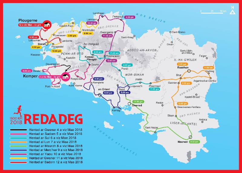 La Redadeg se tient tous les deux ans. Lancée en 2008, cette course à pieds est destinée à promouvoir la langue bretonne. L’édition 2018 va s’élancer de Quimper pour se terminer à Plouguerneau. Entre les deux, c’est à un grand tour de Bretagne que se livreront les coureurs. Quelques 1 800 kilomètres parcourus de jour comme de nuit sans interruption.