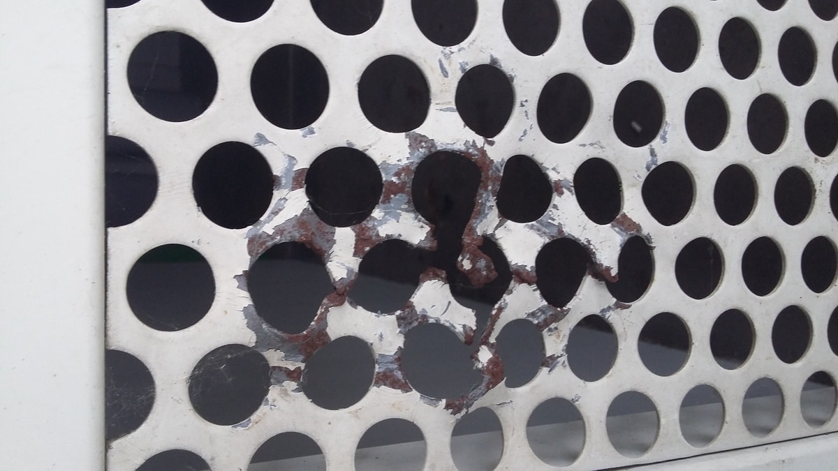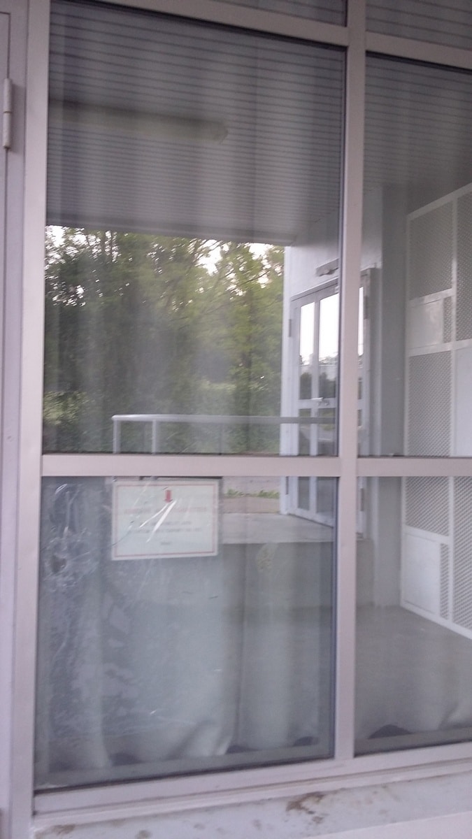En allant faire un tour sur place pour constater les dégâts, nous sommes tombés sur des lieux étrangement désertés par les bloqueurs, dont quelques uns étaient très occupés, en contre-bas, à taguer au feutre le panneau qui présente le projet du nouveau Tertre. Les auteurs de l’effraction avaient en effet cassé une vitre, et juste à côté, commencé à cisailler l’épaisse grille du local à poubelles, près de la serrure.
