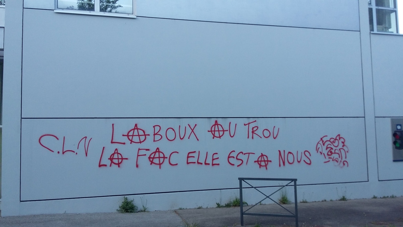 Si le bâtiment FLCE n’est plus occupé – et dûment surveillé – son pourtour est couvert de tags contre la loi ORE promulguée le 8 mars dernier, le président Olivier Laboux – dont le manque de résolution a pourtant bien aidé les bloqueurs – le doyen FLCE Didier Delorme et un exhaustif « si toi aussi dans la vie t’as plus rien à faire, fais comme moi, mobilise-toi ». Sans commentaires…