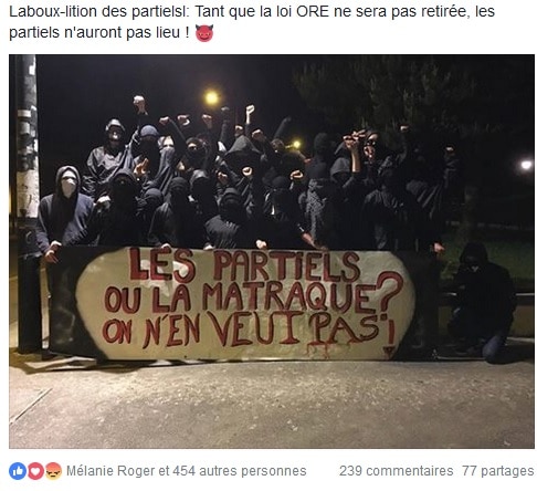 Sous le slogan « exigeons Laboux-lition des partiels » [le président de l’Université de Nantes s’appelle Olivier Laboux] et une photo de famille avec 30 cagoulés, l’extrême gauche joue en effet une bataille stratégique : même si les bloqueurs étudiants ne sont que très peu nombreux – le noyau dur compte une quinzaine d’étudiants seulement – ils n’ont guère eu le temps de réviser, et s’ils ne passent pas leurs partiels, ils n’auront pas leur année. Donc ils ne pourront pas recommencer l’an prochain blocus, casse et dégradations aux frais du contribuable.