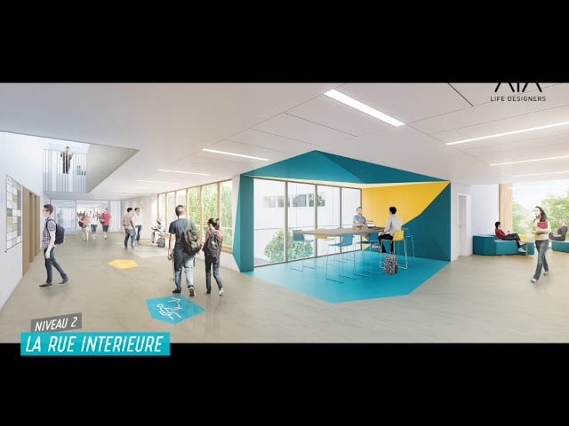 - un bâtiment principal sur 3 niveaux regroupant les fonctions accueil, administration, foyer des élèves, CDI, salle polyvalente… au RDC et les salles de cours banalisées et spécialisées dans les étages,