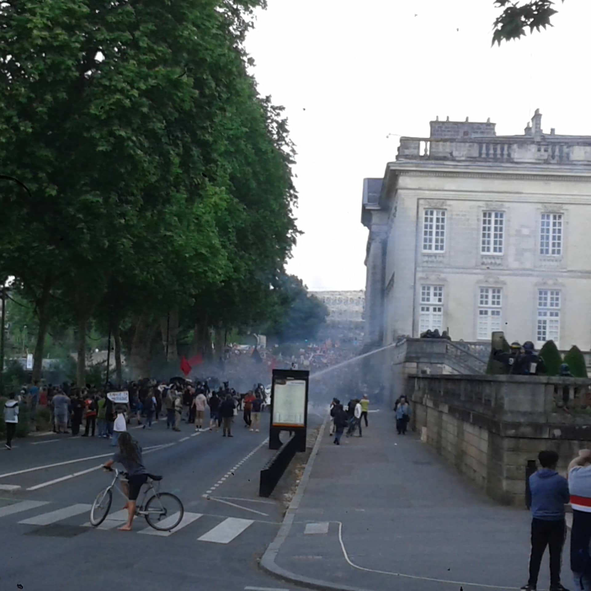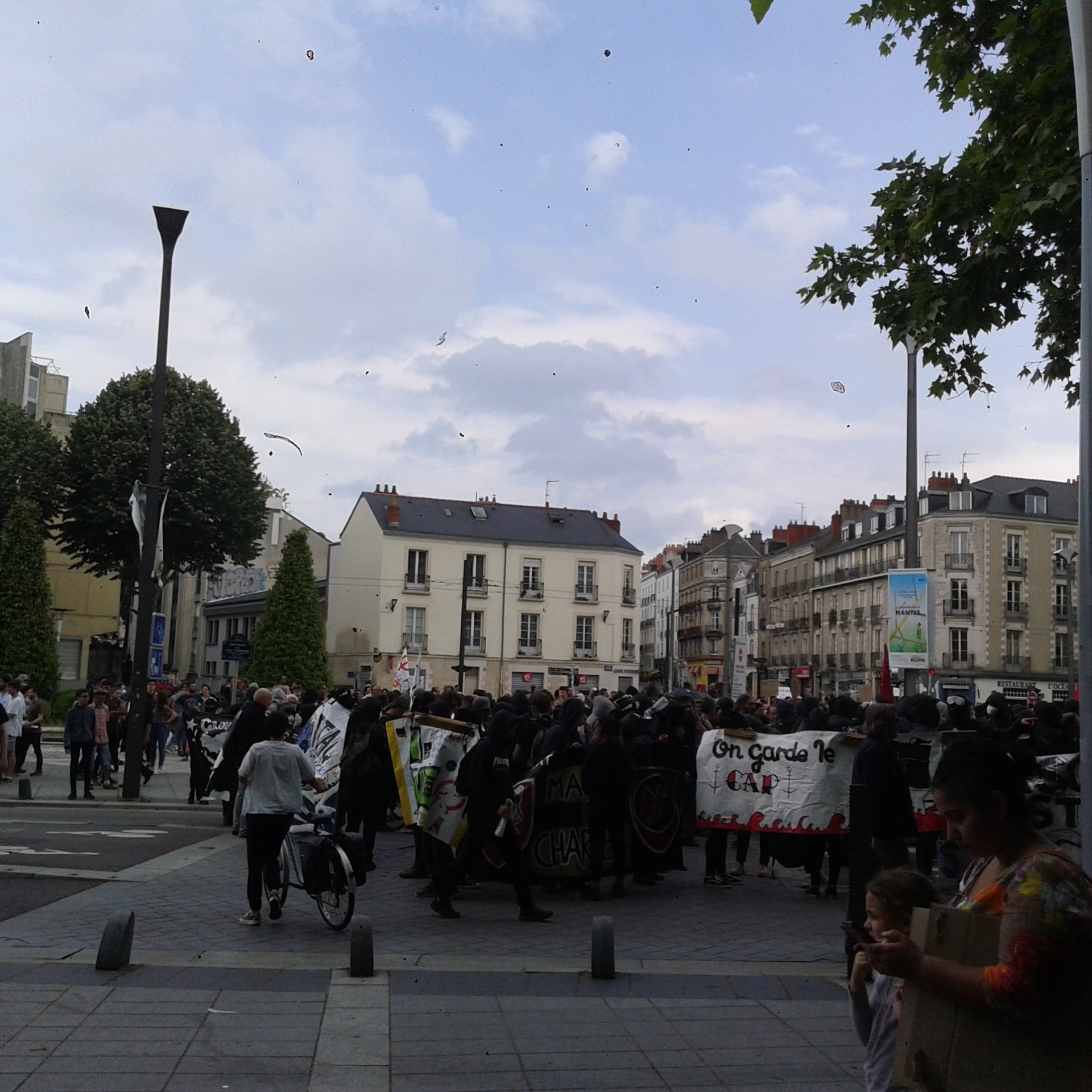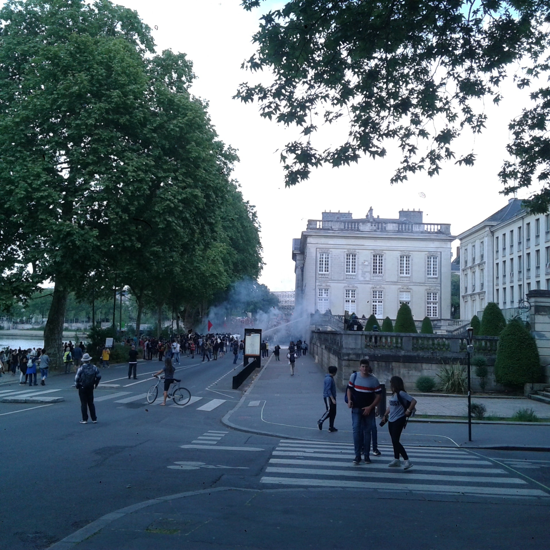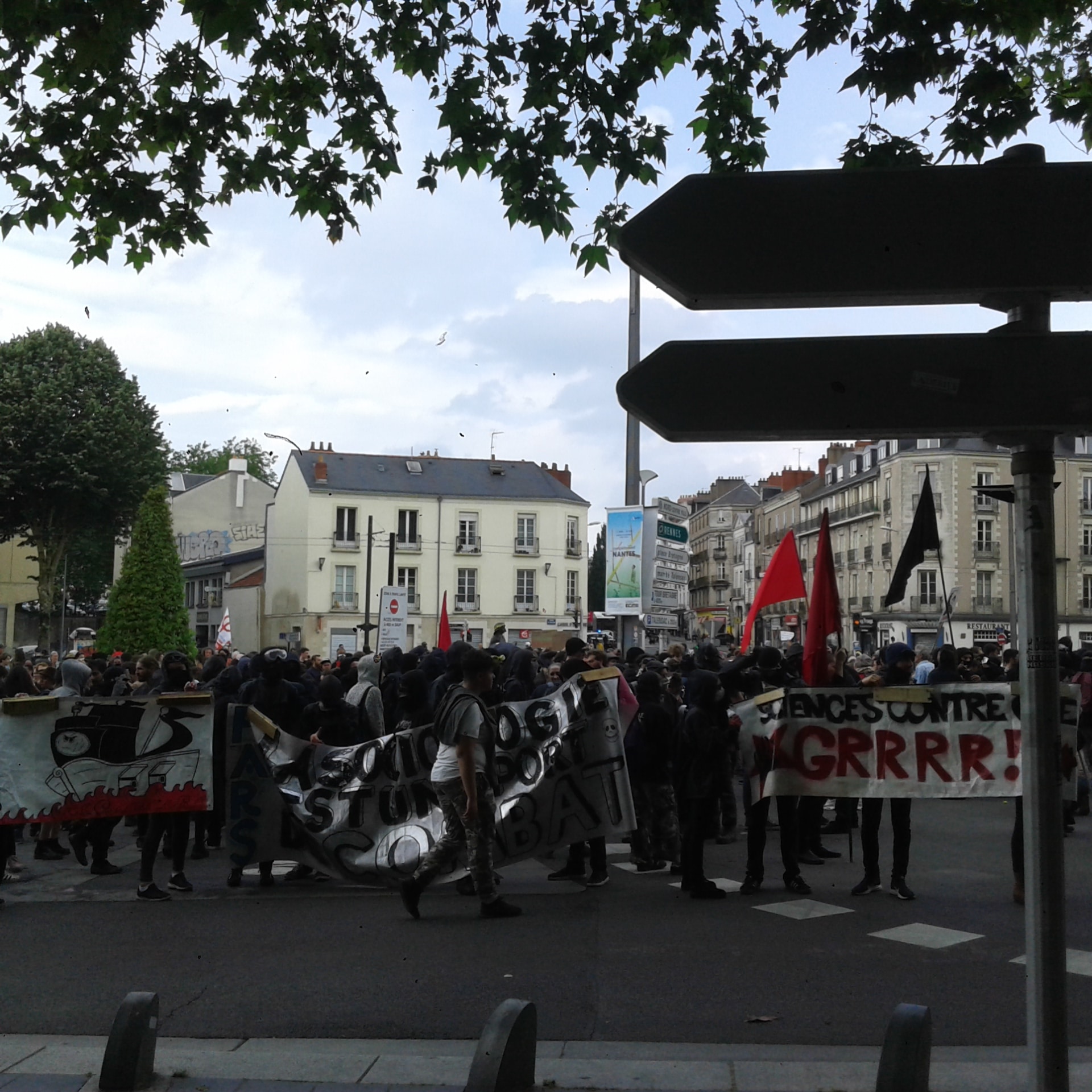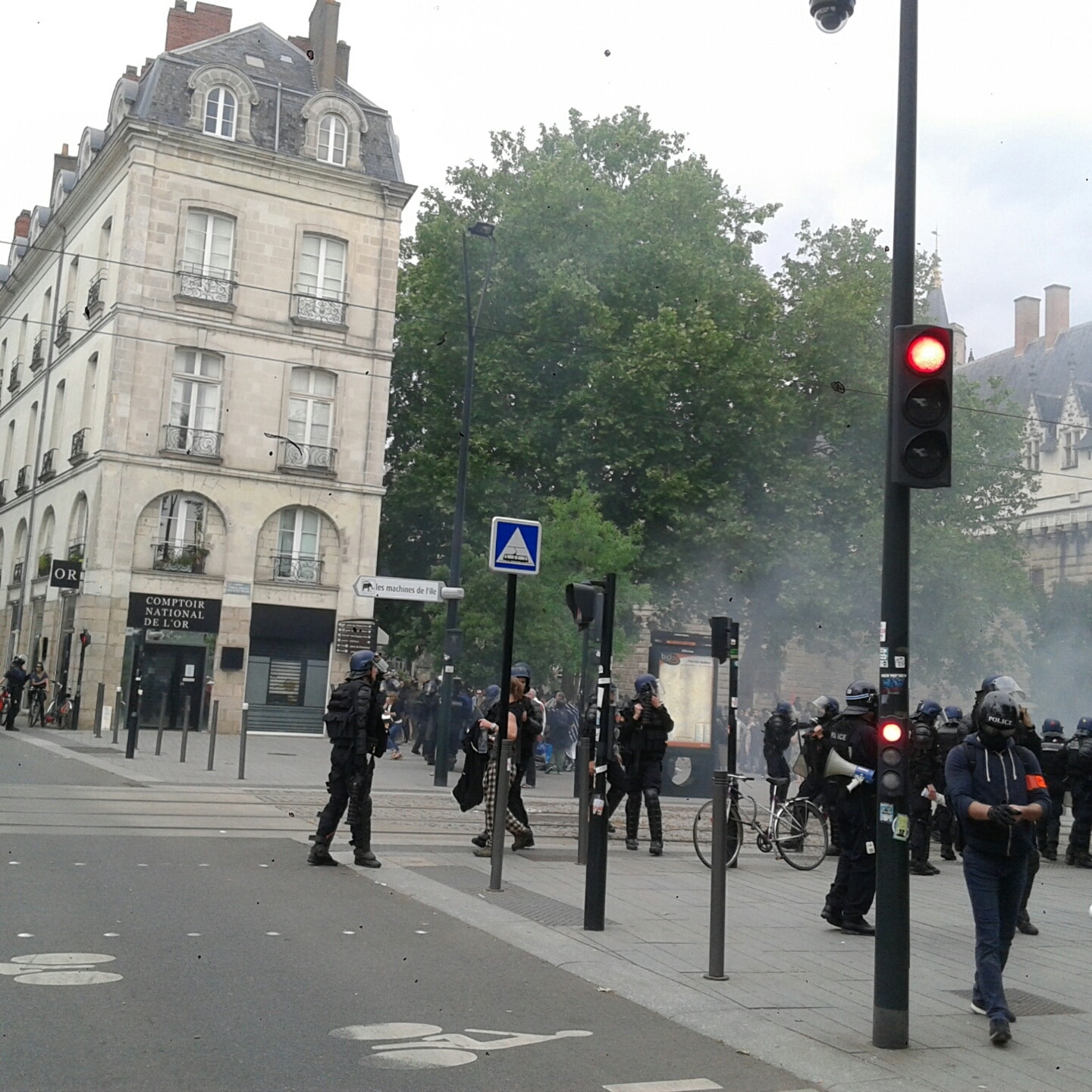A Nantes, où 4000 manifestants ont défilé, une émeute a éclaté comme d’habitude aux abords de la Préfecture. Les CRS postés sur la terrasse ont été visés avec des planches en bois, des pierres, des billes de peinture et des bâtons – ils ont répliqué avec une lance à eau et des lacrymogènes, séparant un moment les casseurs du cortège. Des tags ont été faits sur la Préfectureet les murs aux abords de la place Louis XVI. Du mobilier urbain et des sucettes publicitaires cours des Cinquante Otages ont été détruits.