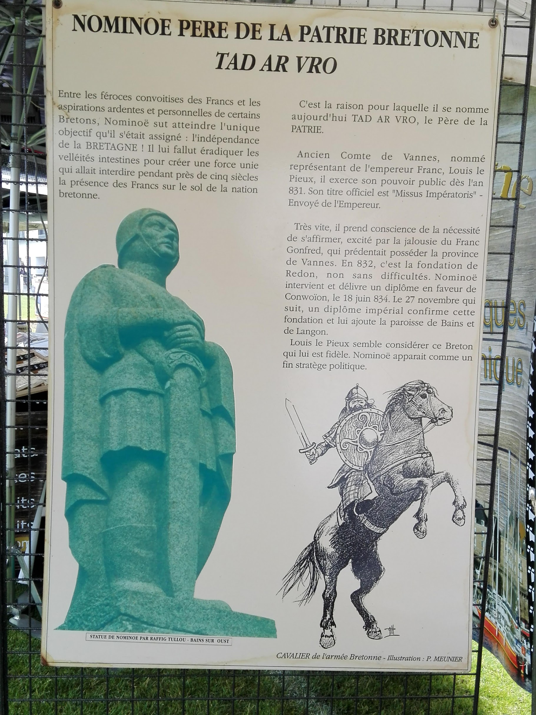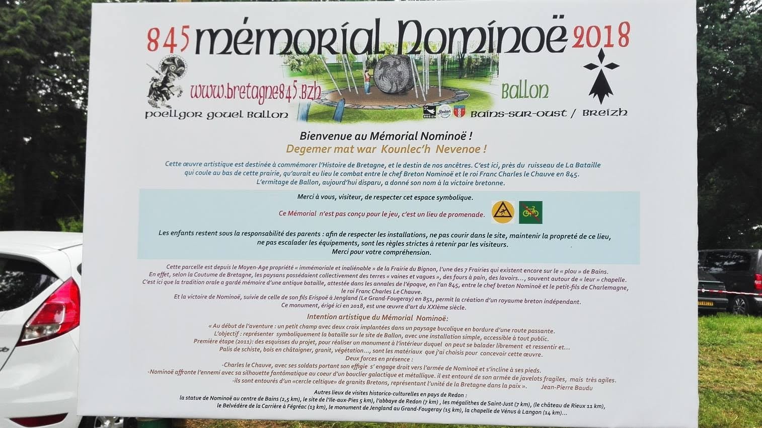 C’est ici à Ballon, sur la commune de Bain sur Oust, que Nominoë et son armée, faisant face aux troupes françaises menées par Charles Le Chauve, remportèrent une victoire décisive dans l’histoire de la Bretagne. C’est donc en ce lieu chargé d’histoire que l’artiste du pays de Redon, Jean-Pierre Baudu a choisi d’installer ce monument.