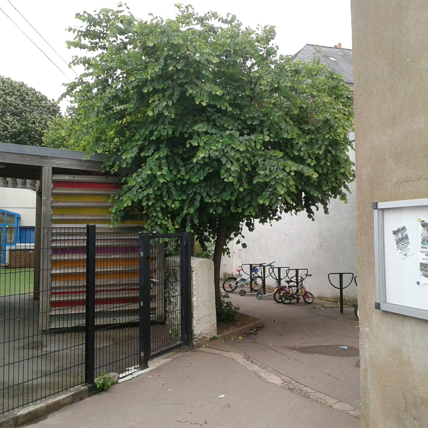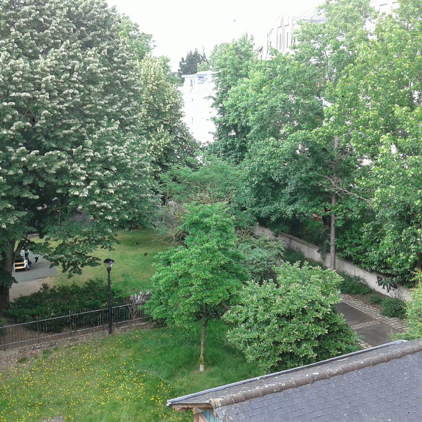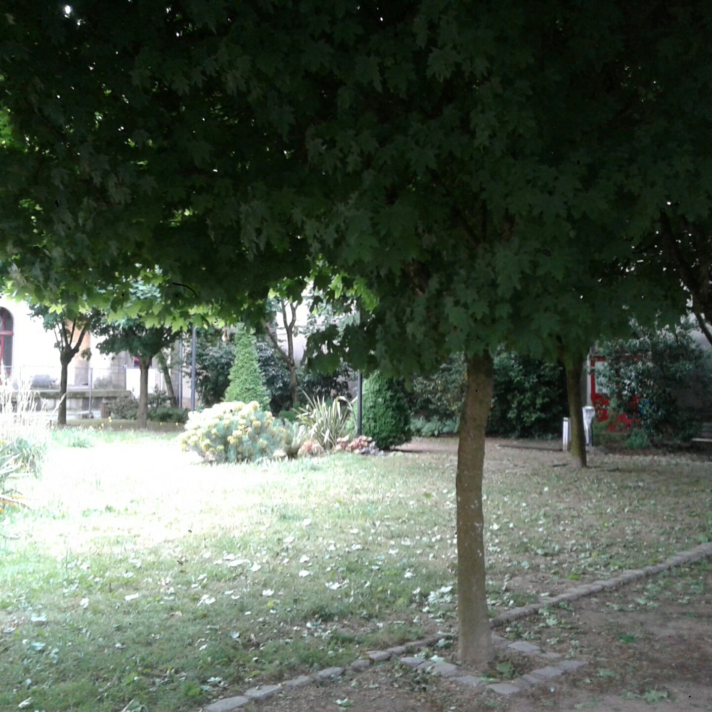 Sous les buissons, des détritus divers. Au fond de la cour arborée, très sombre le soir, une porte rouge, condamnée. « Elle donne sur les locaux des A.S.V.P », confie le riverain. « Avant, ils venaient faire leur pause dans le square, sous les arbres. Mais ils ont fermé la porte, car chez eux ils ont eu des vols ( !). A Noël 2017 encore, ils se sont fait voler de la nourriture qu’ils avaient mis de côté pour le repas de Noël, et malgré les cadenas. Donc ils ont condamné cette porte ». C’est dire…