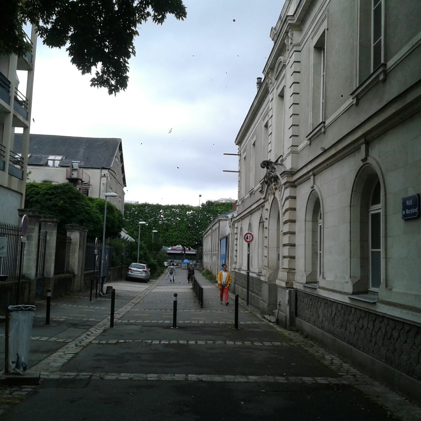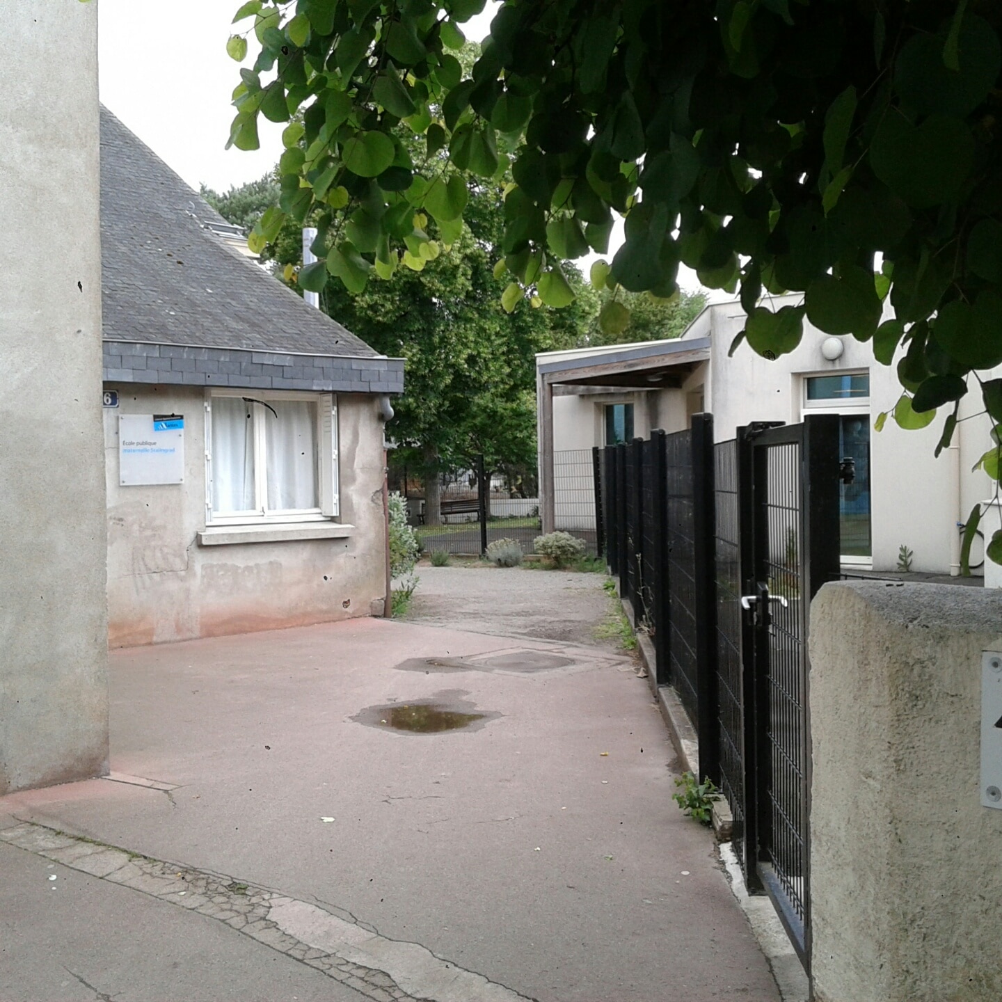 L’allée du Bourg Fumé donne sur la rue de Maryland, flanquée d’un côté des bâtiments de la Manufacture – avec un petit jardin au milieu, arboré et pas éclairé – de l’autre de l’école primaire Stalingrad. Elle est encadrée de grilles, puis de murs. Au début, dans une cour, il y a un hangar qui dépend de la Ville. « On s’est déjà fait tirer sur nos fenêtres avec des billes de paintball », explique un employé. « Et on s’est fait voler des choses aussi, en plein midi. Un PC l’année dernière, un vélo électrique aussi, on était à cinq mètres, mais trop tard ».