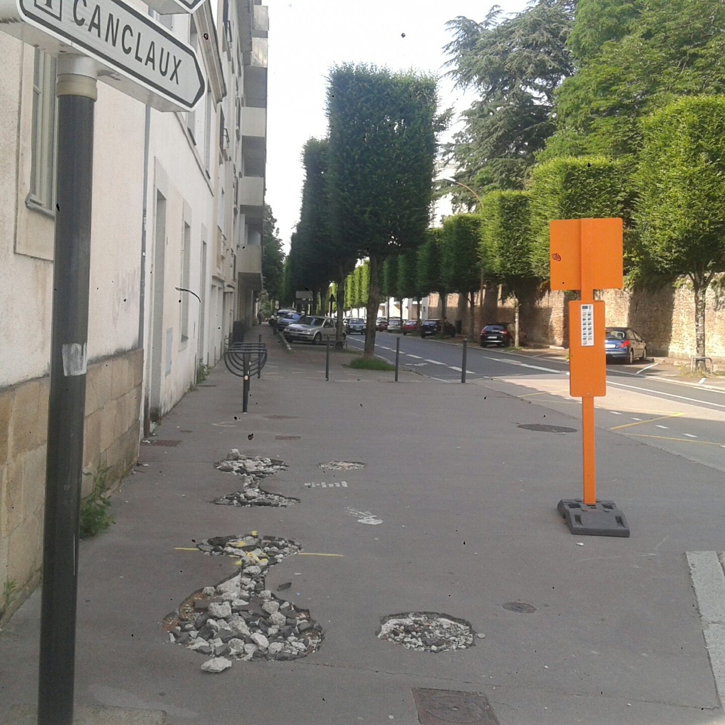 À la faveur de notre enquête sur l’état des voiries à Nantes – dont le premier volet est sorti pour le quartier des bords de la Chézine et de Grillaud – nous avons constaté encore que les abribus de la place Mellinet n’étaient matérialisés que par des poteaux provisoires orange. Idem pour le terminus du C5 à gare sud d’ailleurs. Et pour bien d’autres arrêts. Les commandos de choc de JcDecaux peinent toujours à remplacer les 960 abribus du marché dont 591 sur Nantes.