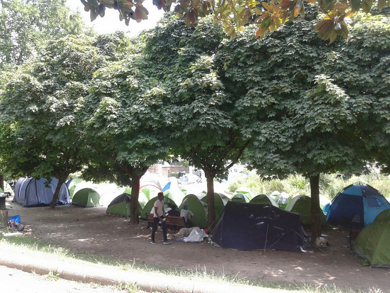 Ils sont déjà plusieurs centaines – jusqu’à 250 selon la police – principalement issus du Soudan et de l’Érythrée, dans le trou du square Daviais entre la place du Commerce – haut lieu du trafic de stupéfiants depuis plus de deux ans par des clandestins, issus du Maghreb ceux-là – et le parking Gloriette. Des tentes se collent les unes aux autres sous les arbres du square, mais débordent aussi au-dessus jusqu’à la Petite Hollande. D’autres dorment en plein jour sur l’herbe. De la lessive sèche sur les clôtures du jardin urbain, tandis qu’un petit camion « ZAD medic » à l’hygiène déplorable tient la permanence le jour du côté nord du square.