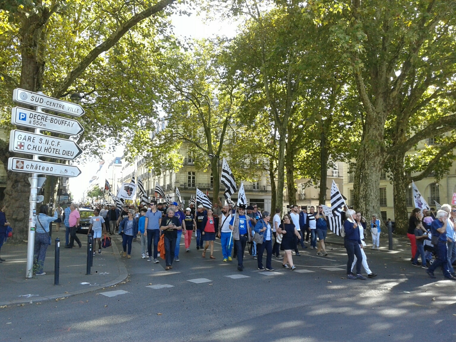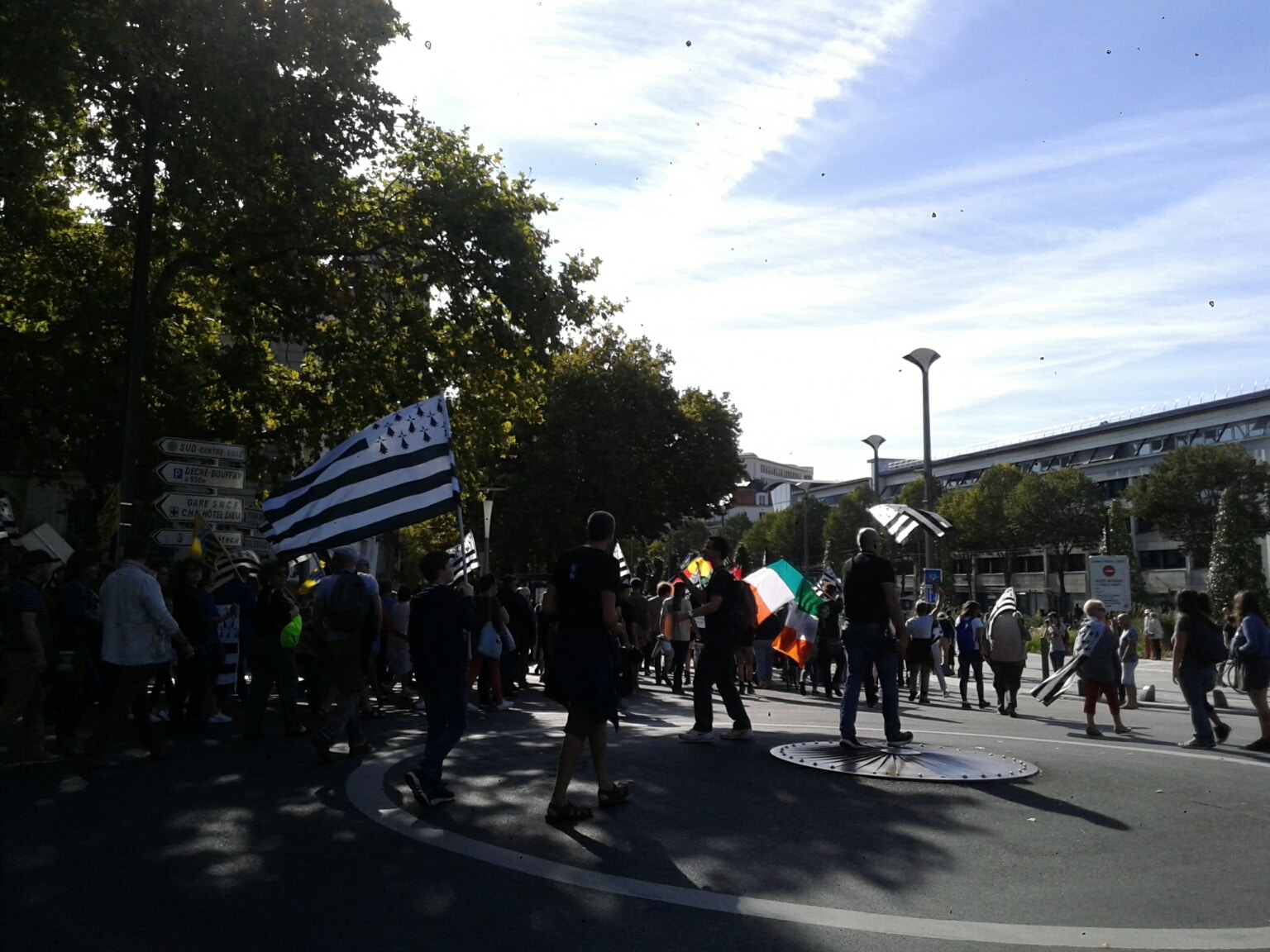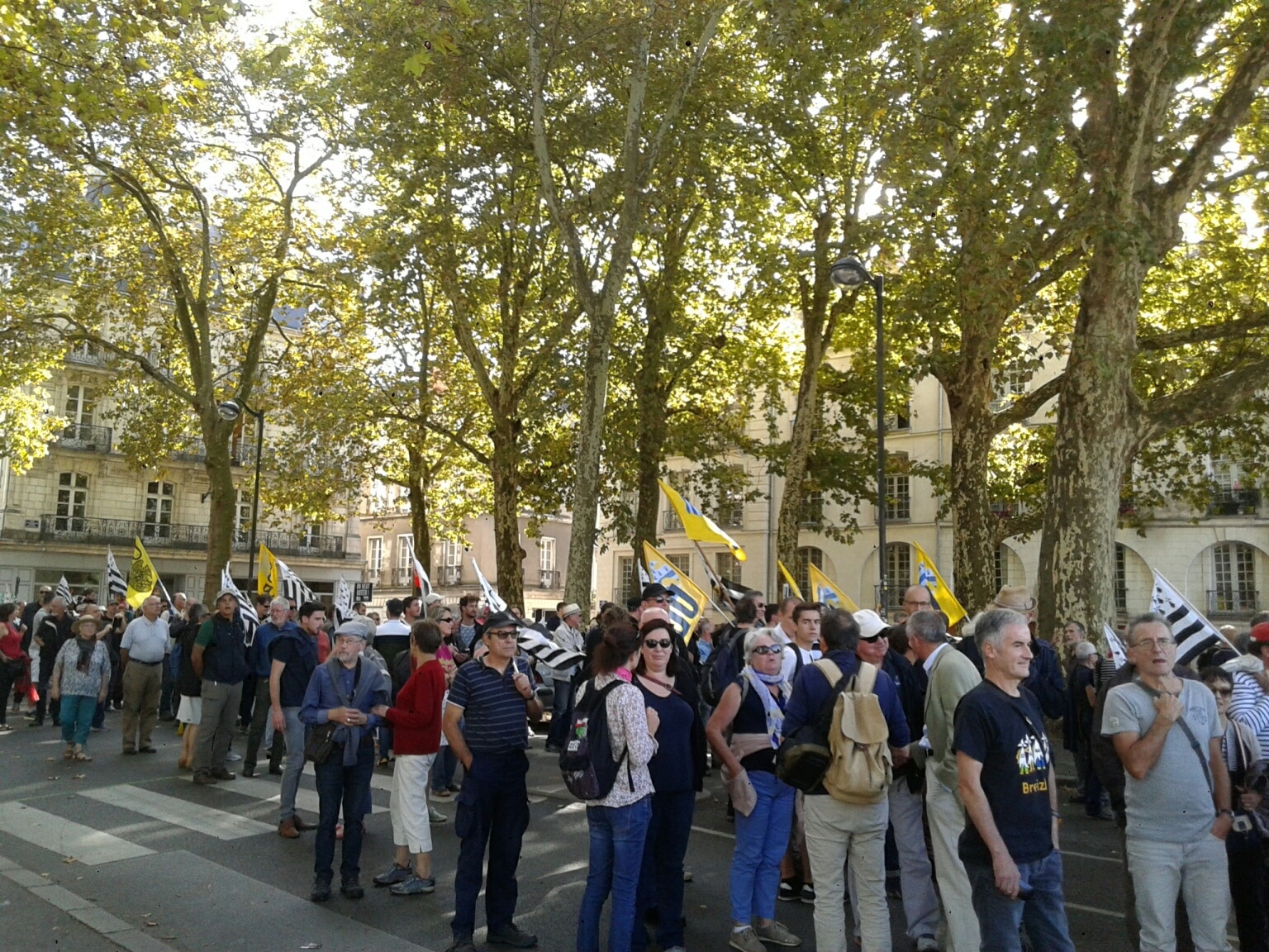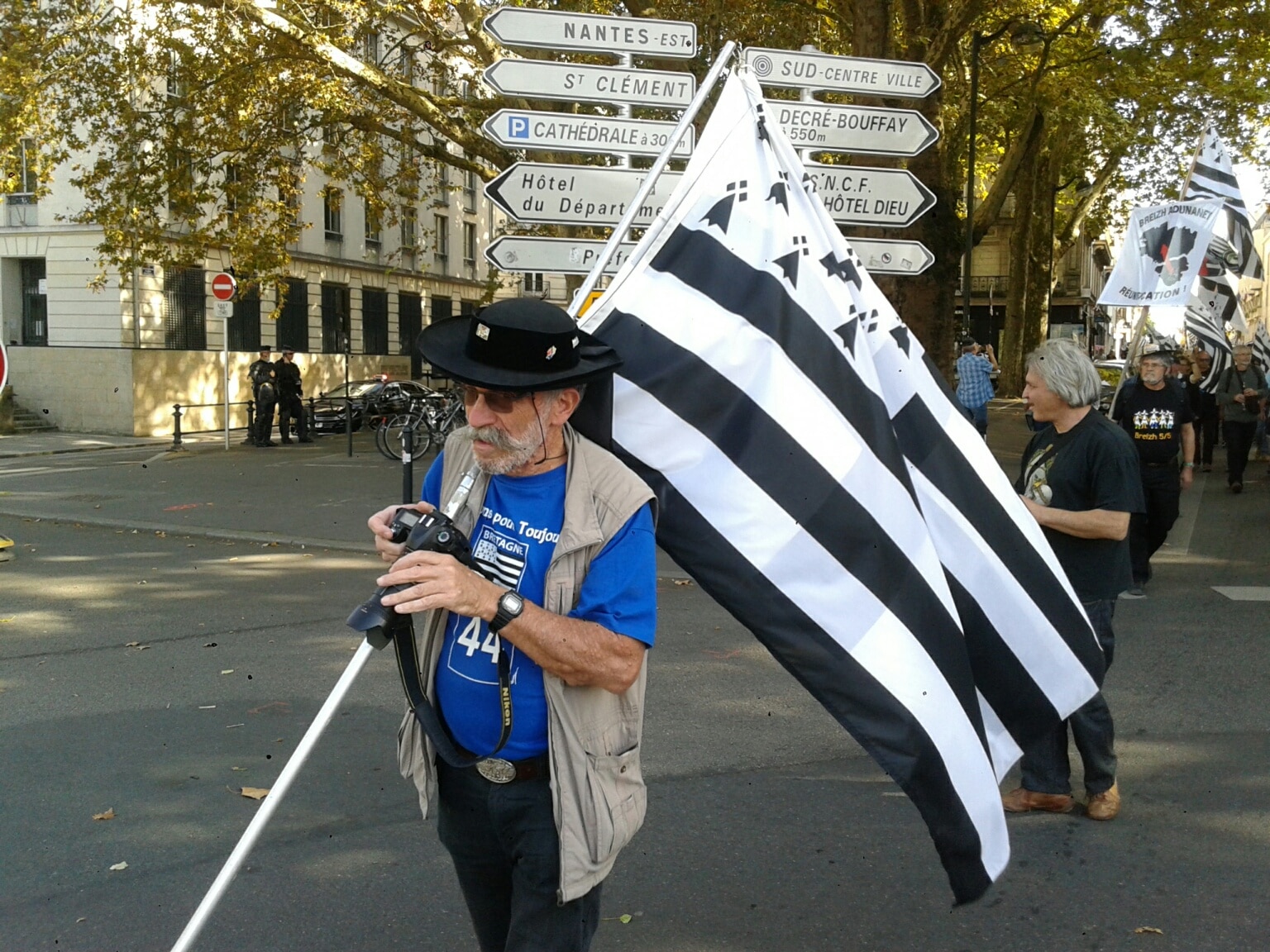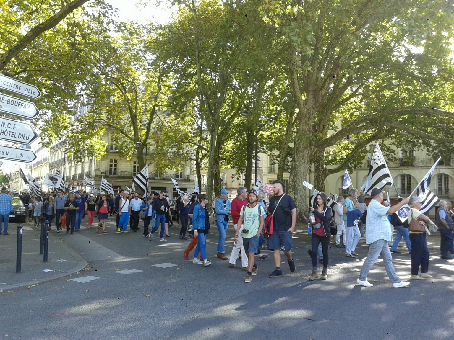 Lancée à l’appel du collectif 44=BZH, sorte de parasitisme de la cause bretonne par une extrême gauche pourtant internationaliste et de l’UDB, la manifestation a peiné à sortir des postures, entre jeunes gauchistes et retraités sympathiques avec binious et drapeaux montés sur des cannes à pêche.