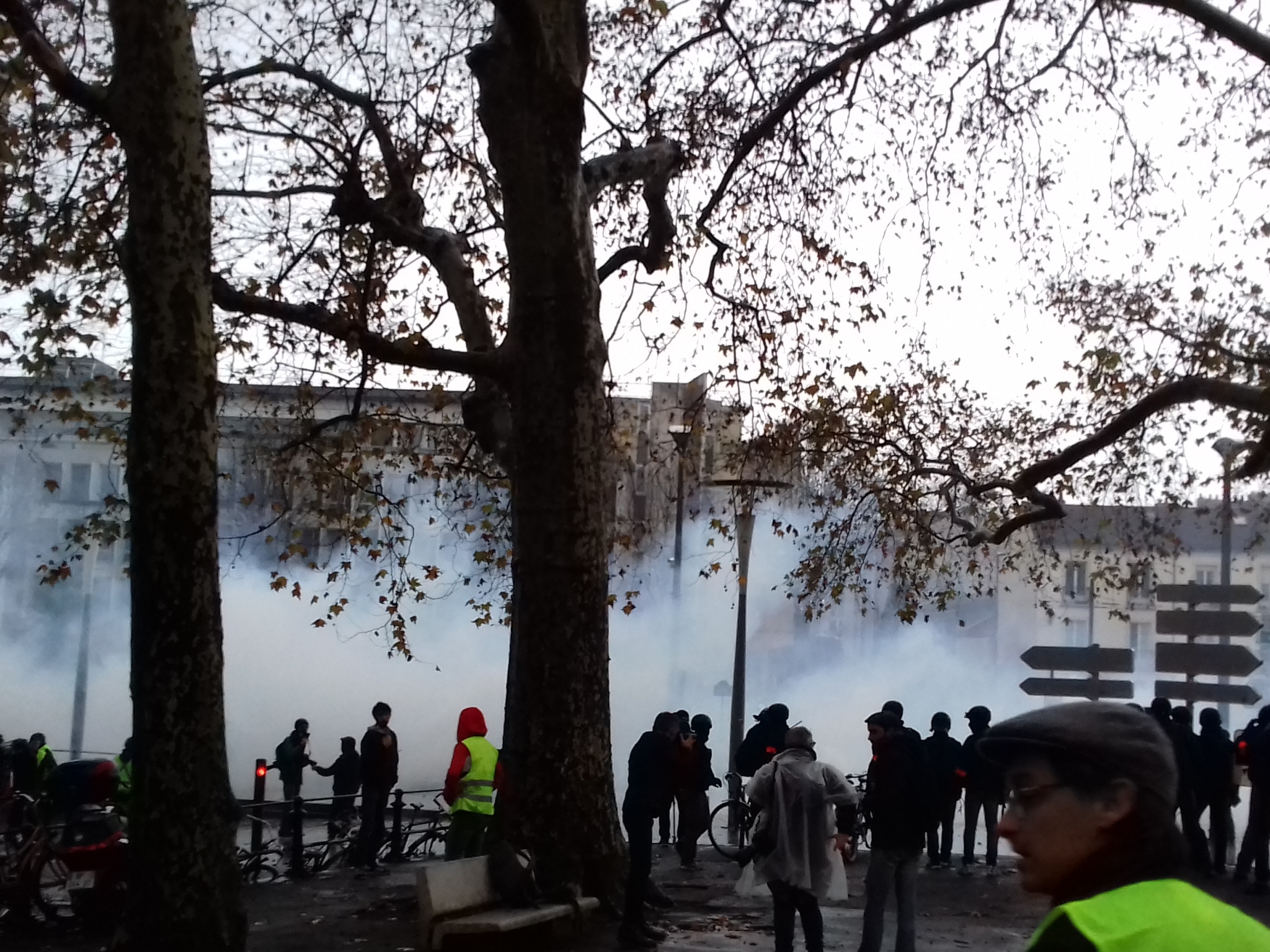 #GilestJaunes Nantes Les forces de l ordre avancent cours des 50 orages. La foule recule. « Ils sont où les casseurs,? On est des pacifistes. Vous nous avez gazé comme des clochards», hurle une femme gilet jaune qui se met devant eux pic.twitter.com/eY05xBipOc