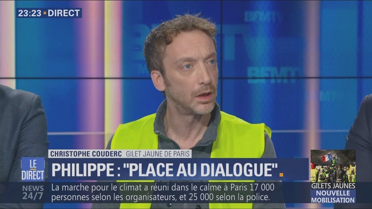 Christophe Couderc, des Gilets jaunes, s’exprimait samedi soir sur BFMTV, en appelant à une nouvelle manifestation samedi prochain, à Paris : «Emmanuel Macron et son gouvernement ont pour mission la liquidation de la France. Comme tous mes camarades Gilets Jaunes, j’appelle à l’Acte V samedi prochain à Paris, et il faudra faire cela tous les week-ends. (…) Macron ne peut pas finir son Quinquennat.»