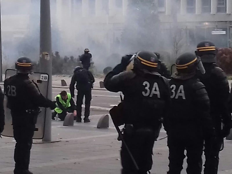 Le jeune homme, blessé à la tête près de la préfecture au début d’une charge de CRS – il aurait reçu selon les témoignages un coup de flashball ou un palet de lacrymo – a été pris en charge par les pompiers trois minutes après sa chute. Il avait une blessure au cuir chevelu – impressionnante du fait d’une mare de sang par terre – mais légère. Au moment de l’évacuer sur civière, les pompiers lui parlaient et il était conscient.