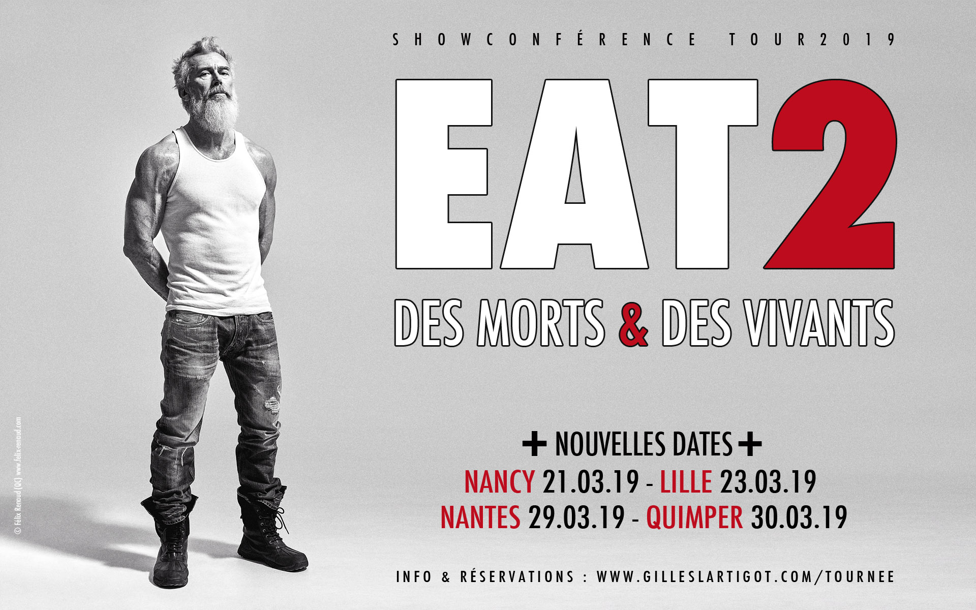 « Après les tournées « On est ce que l’on mange » en 2014, « La Nourriture Originelle » en 2015 et « Résilience » en 2016, je vous propose un nouveau showconférence qui s’articulera autour des thèmes que je développe dans mon nouveau livre EAT2.» explique celui qui fait de chaque conférence un véritable spectacle, et une démonstration efficace pour faire passer ses réflexions, ses constats, ses idées, sur notre alimentation, nos modes de vie.