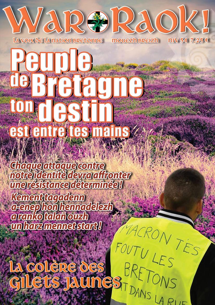 Pourquoi ce rapide survol de l’histoire de notre nation bretonne ? Tout simplement pour « coller » à la réalité politique actuelle, à cette tempête jaune, ce soulèvement populaire conséquence d’un réel malaise social. En Bretagne nos sympathiques gilets jaunes défilent sous les couleurs nationales bretonnes, Gwenn ha Du et Kroaz du, et boudent manifestement le drapeau de la république française ! C’est l’affirmation d’une appartenance à un peuple distinct, c’est également la défense d’un mode de vie en train de disparaître reposant sur des valeurs traditionnelles et sur une culture spécifique enracinée. Néanmoins, très certainement par manque de culture politique, mais surtout par méconnaissance de leur propre histoire, histoire que l’État français refuse obstinément d’enseigner avec la complicité de l’Éducation coloniale française, il manque donc dans le cahier de doléances de nos gilets jaunes bretons des revendications spécifiquement bretonnes. La fierté du drapeau ne suffit pas. Il faut exprimer des exigences politiques, exigences dues au peuple breton comme à tous les peuples aujourd’hui privés de leurs droits nationaux. C’est l’occasion ou jamais de mettre l’État français au pied du mur, d’exiger un statut de large autonomie pour la Bretagne, statut représentant la première étape de l’émancipation du peuple breton. Avec ce statut les Bretons pourront ainsi gérer leurs propres intérêts économiques, vivre selon leurs propres aspirations, leurs croyances, développer et enseigner leur langue… Voilà ce qui doit figurer en lettres rouges dans le cahier de revendications des gilets jaunes bretons. Ainsi précisé, ce combat sera celui d’authentiques défenseurs d’une civilisation millénaire que certains, regroupés dans une « caste d’intouchables », d’élites hors sol, de cosmopolites, de progressistes ou encore d’européo-mondialistes, veulent abattre.